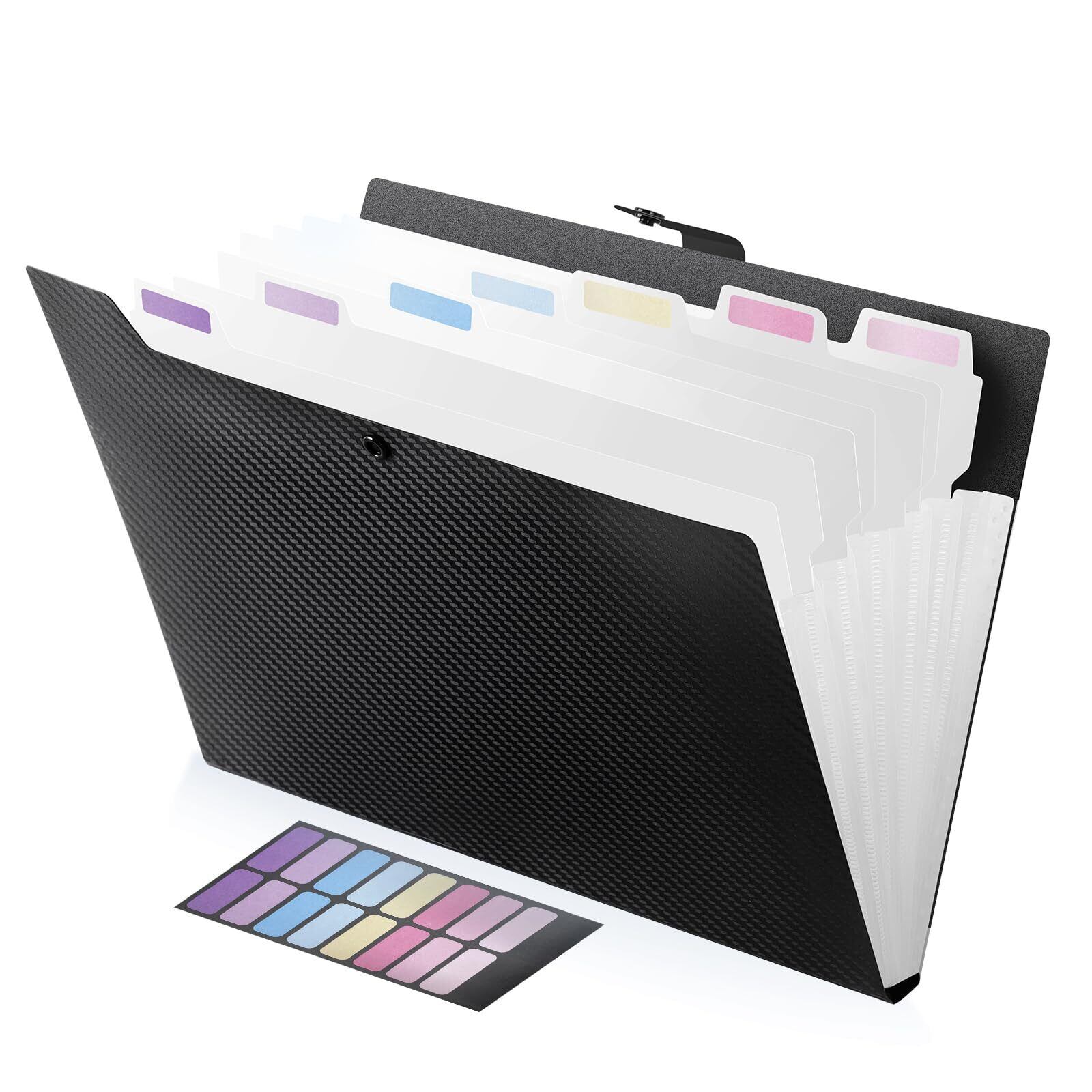 FRETONBA ドキュメントファイル 8ポケット A4 クリア 拡張フォルダー スナップ式 ジャバラファイル 仕分け ラベル付き 防水 分類収納 透明仕切り プリント整理 書類整理ボックス 多機能 書類ケース 軽量 持ち運び可能 (ブラック)