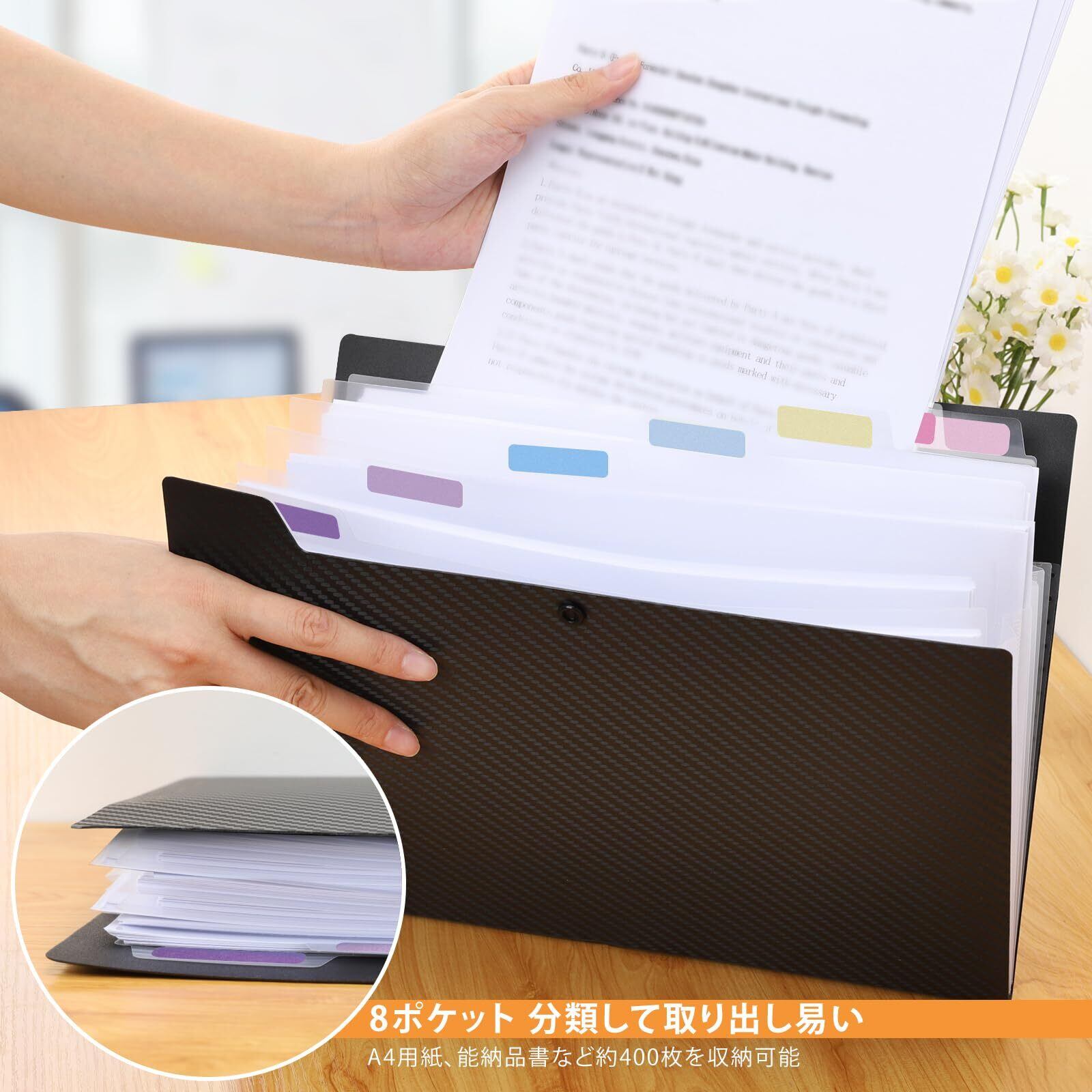 【分類便利】8つの独立ポケット構造になっており、様々な書類を細かく分類できます、インデックスタブ付き、必要な書類を簡単に素早く見つけることができます。書類の整理及び収納はもっと便利です。