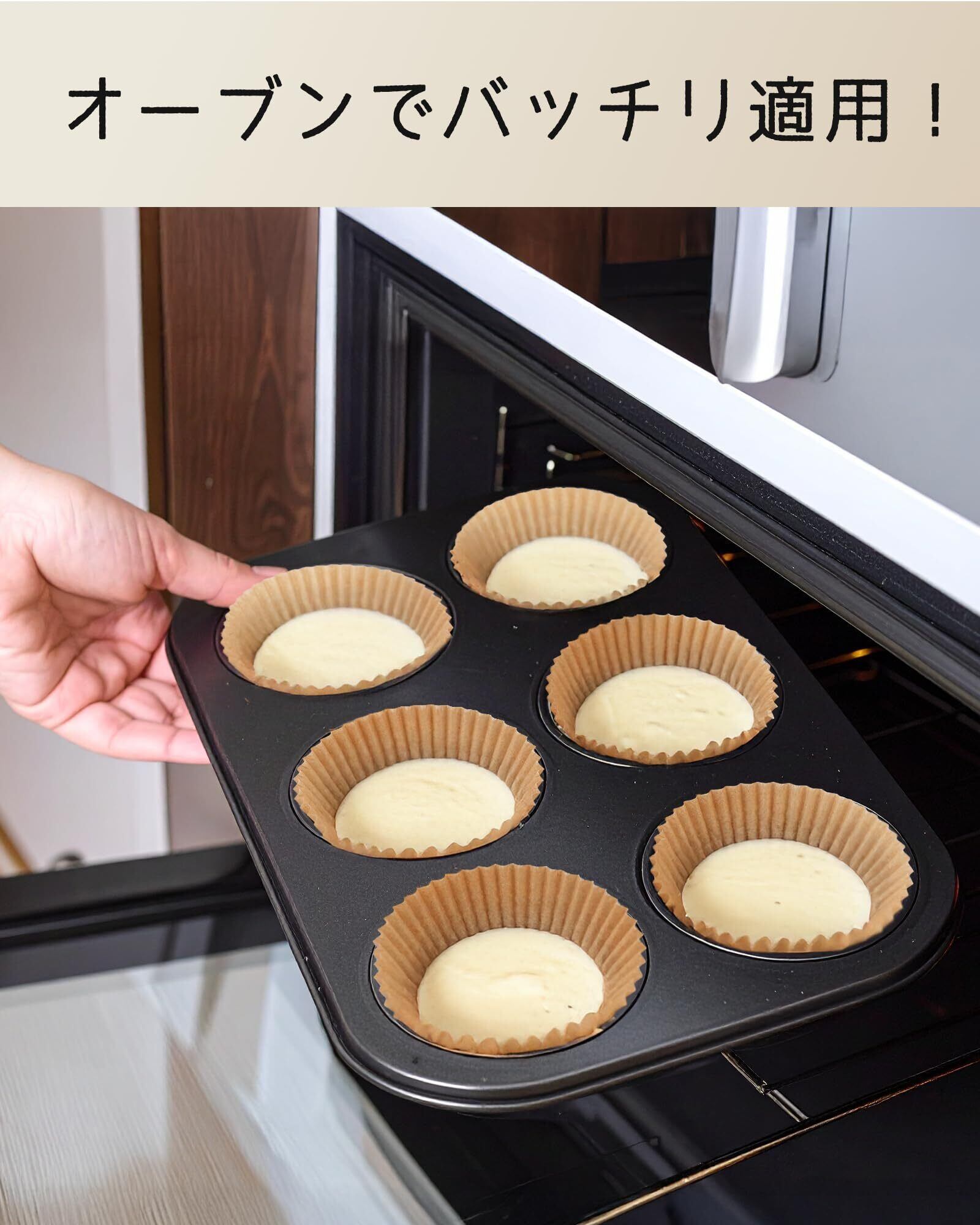 【ベーキングカップとおすすめ!】当社のベーキングカップと組み合わせることは最適。下処理の時間を節約できる。型からスッポリに取り出せる。友人と楽しむのにも便利で、使用後のお手入れも簡単です。