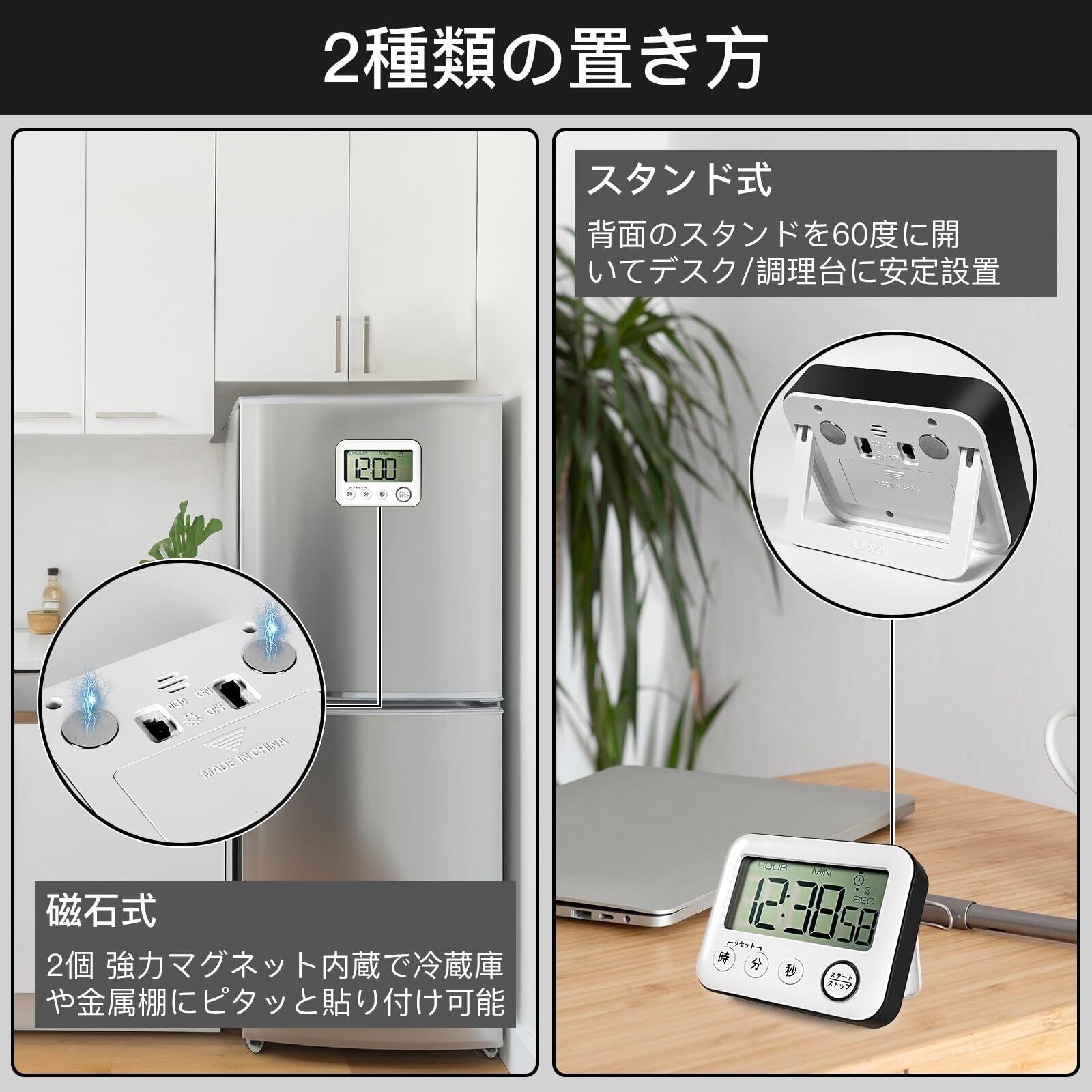3in1多機能タイマー大画面表示 12/24時間デジタル時計キッチン アラーム 磁石式とスタンド式設置 無音光/音アラーム切替式 勉強/キッチン/スポーツ兼用 (ブラック)