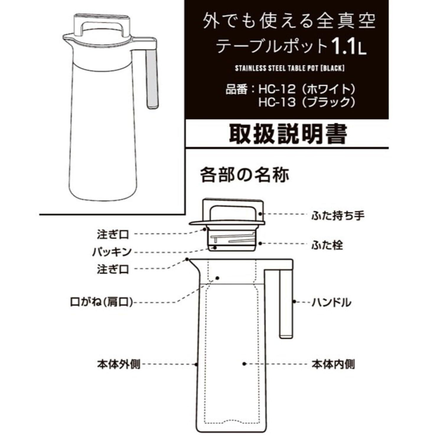 品名:ステンレス製卓上用まほうびん、実容量:1.1L、保温効力:65度以上(10時間)、保冷効力:10度以下(10時間)、素材・材質:本体内側/18-8ステンレス鋼、本体外側/ステンレス鋼(アクリル樹脂塗装)、口がね・ハンドル/ポリプロピレン(耐熱温度100度・耐冷温度-20度)、ふた栓本体/ポリプロピレン(耐熱温度100度・耐冷温度-20度)、ふた栓金属部/ステンレス鋼、ハンドルカバー・ふた持ち手カバー/ABS樹脂(耐熱温度80度・耐冷温度-20度)、パッキン/シリコーンゴム(耐熱温度180度・耐冷温度-20度)