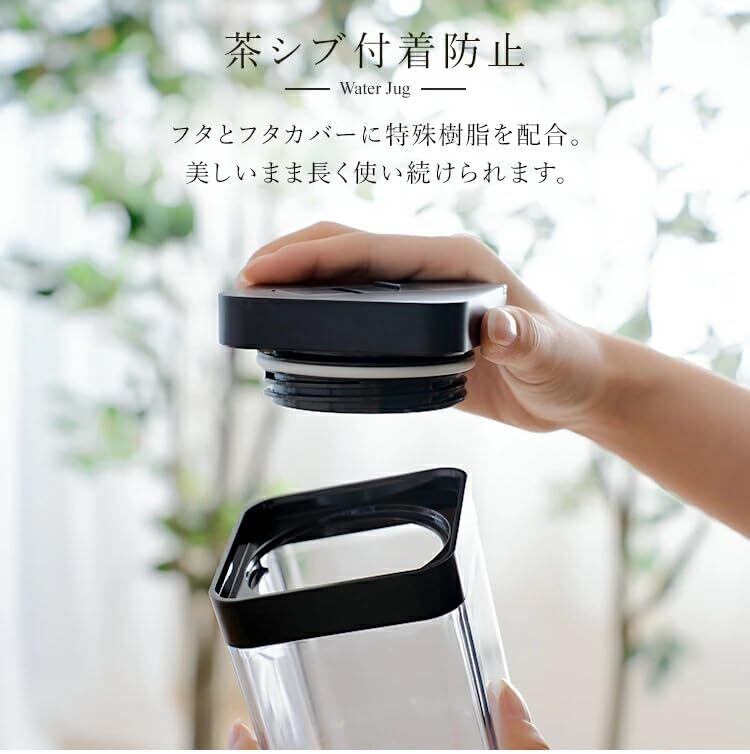 ワンプッシュオープン方式で手軽に注げる。冷蔵庫で横置きしても水漏れしない。スタイリッシュで、卓上にも映えるスクエア冷水筒。