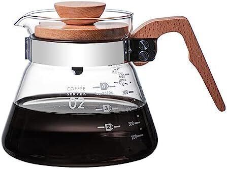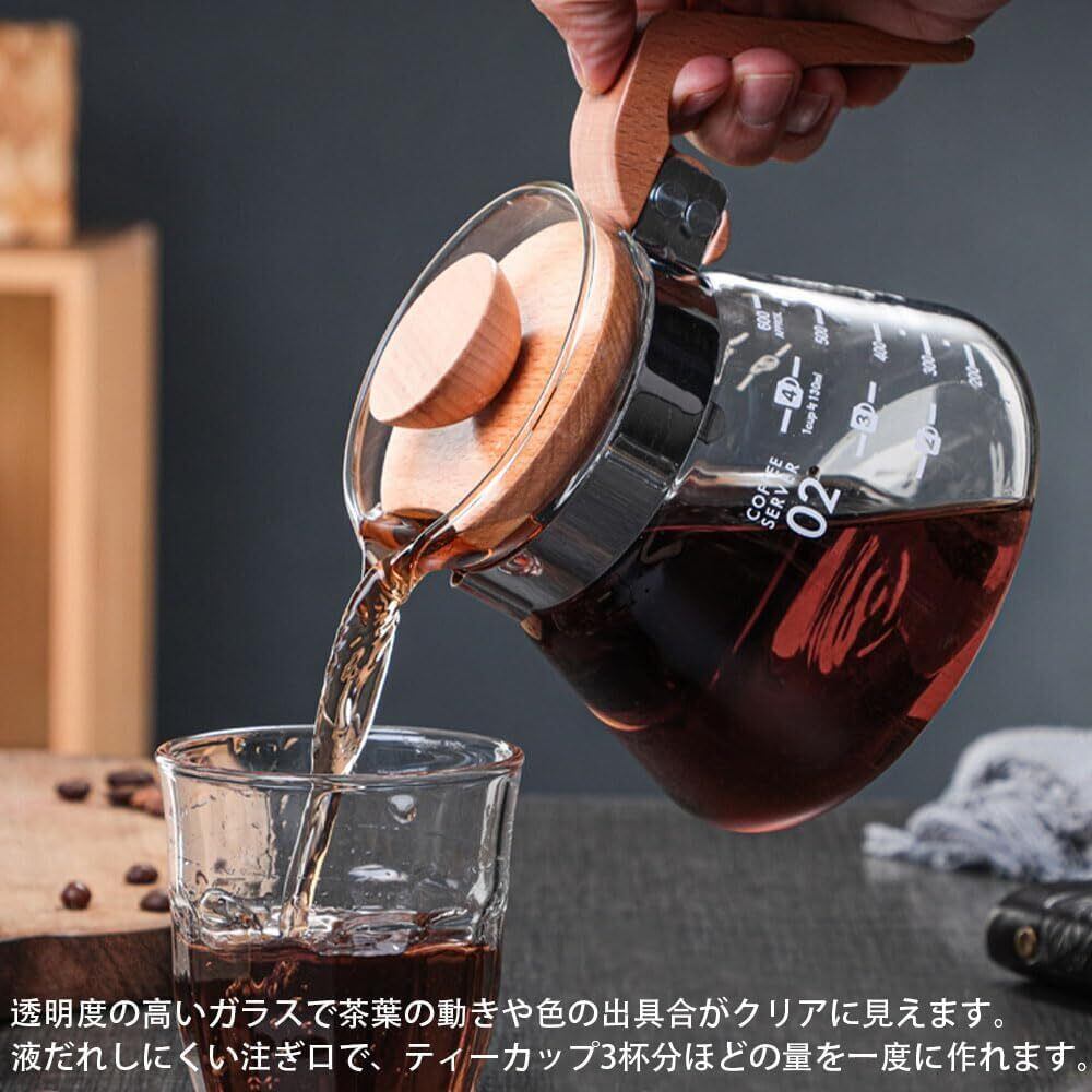 【数量限定】コーヒーサーバー 耐熱ガラス製 コーヒーポット ドリップポット ガラスティーポット 紅茶ポット 電子レンジ対応 耐久性 耐熱性 フタ付き オーク材製ハンドル 口が広い 食洗機対応 洗いやすい 多用途 会社 家族 会議用 (600ml)