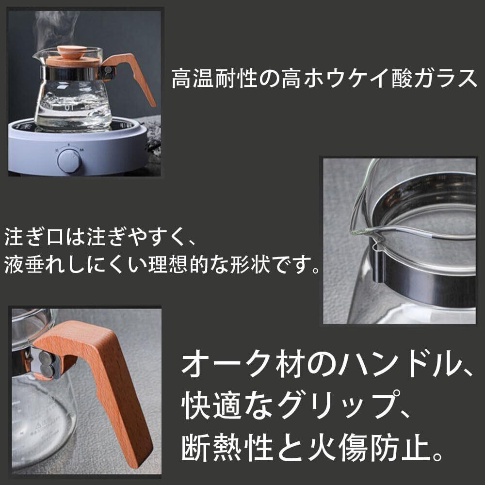 コーヒーサーバー 耐熱ガラス製 コーヒーポット ドリップポット ガラスティーポット 紅茶ポット 電子レンジ対応 耐久性 耐熱性 フタ付き オーク材製ハンドル 口が広い 食洗機対応 洗いやすい 多用途 会社 家族 会議用 (600ml)