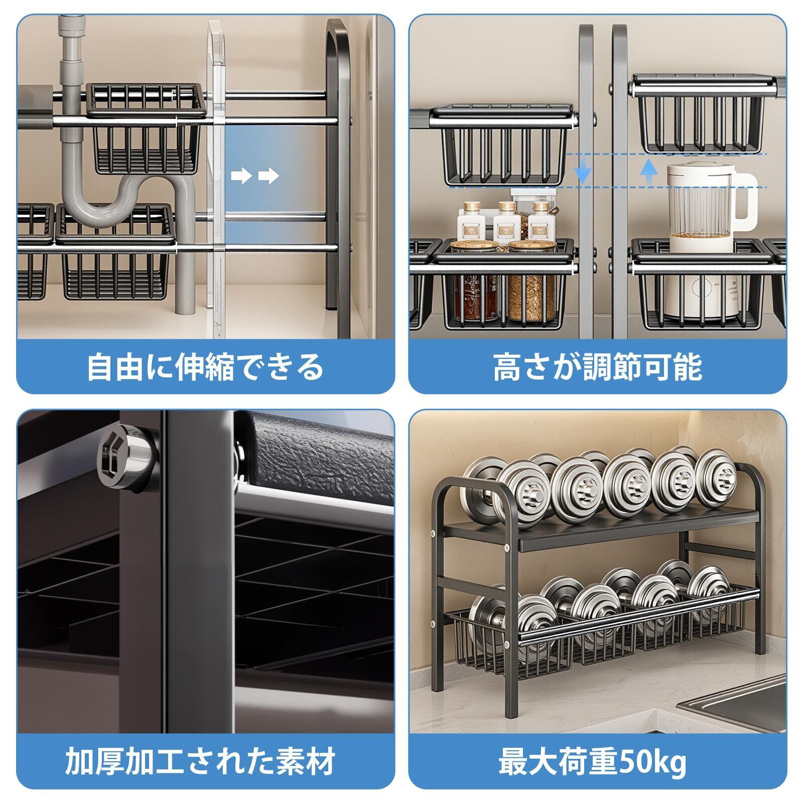 頑丈ステンレス構造:厚みある高品質素材(炭素鋼+PP)採用で最大50kgをしっかり支えるシンク下収納ラック。鍋、フライパン、食器類も安心収納。変形・たわみ知らずの安定性で洗面台下収納ラックとしても最適。防錆・防水・耐摩耗で長寿命。