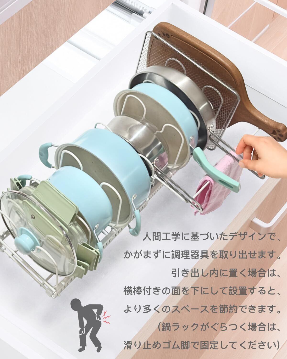 【取っ手を浮かせて、出し入れしやすく】取っ手部分を支えるスタンド付きなので、鍋やフライパンの取っ手を浮かせたまま収納でき、引き出しなどでも取り出しやすくなります。設置の際は、フライパンスタンドの台座で横棒が付いている面を下向きにして、付属のゴム脚を取り付けてください。滑りにくく安定感が増し、安心してお使いいただけます※設置スペースの目安:奥行=鍋の直径+約3cm、幅=鍋の直径+取っ手の長さ以上