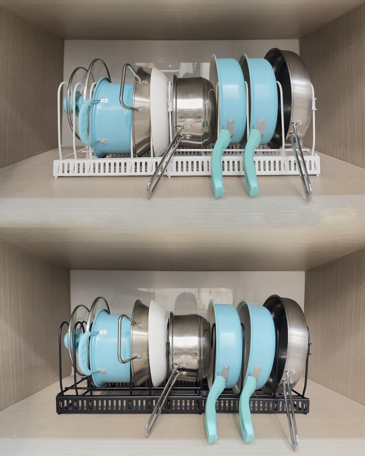 Rievem フライパンラック 伸縮式|10仕切り・持ち手置き付き|鍋・フライパン・鍋蓋・まな板・調理器具を省スペース収納|シンク下・引き出し・コンロ下対応|キッチン収納スタンド (ホワイト)