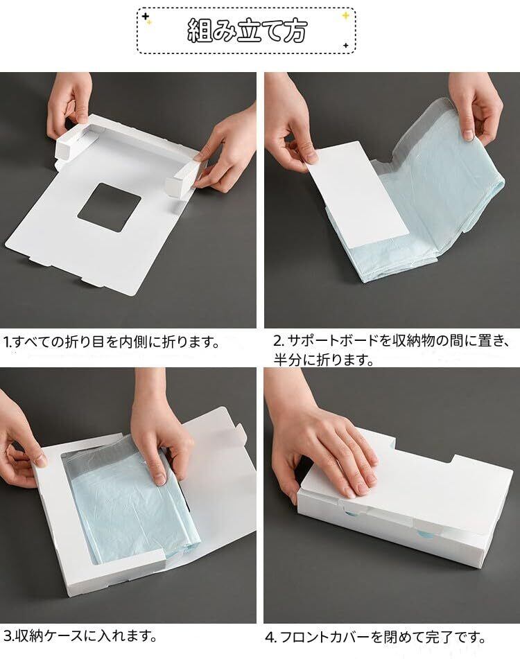 【組み立て簡単】:折り目に沿ってボックスを組み立てるのはとても簡単です。ゴミ袋やポリ袋を取り出すときに散らからないように、支え板を入れるのを忘れないでください。両面テープを使えば、吊戸棚の下や側面等、お好きな場所に貼り付けることもできます!