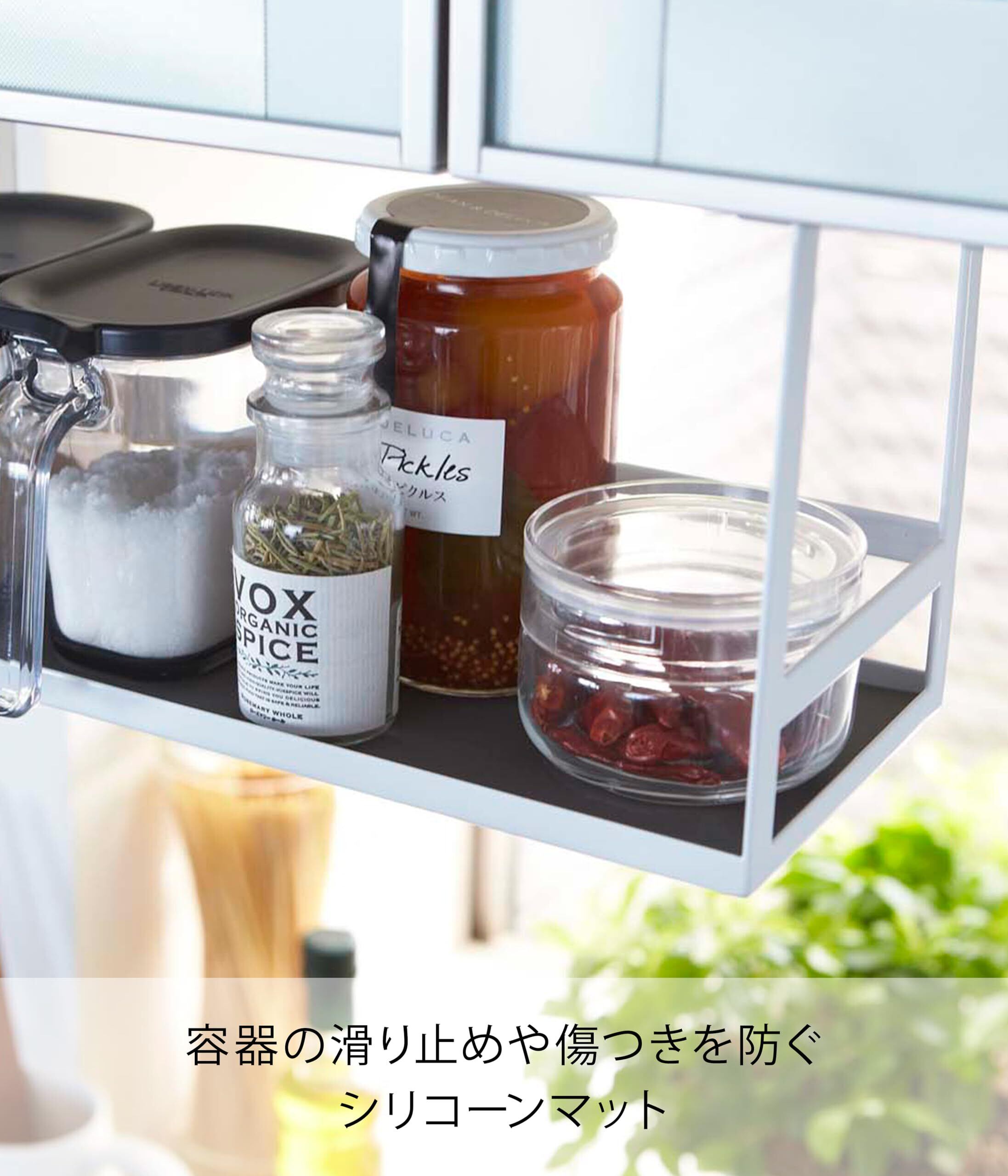 キッチン吊戸棚に取り付けるだけ。よく使う調味料やキャニスターなどのストックに便利。
