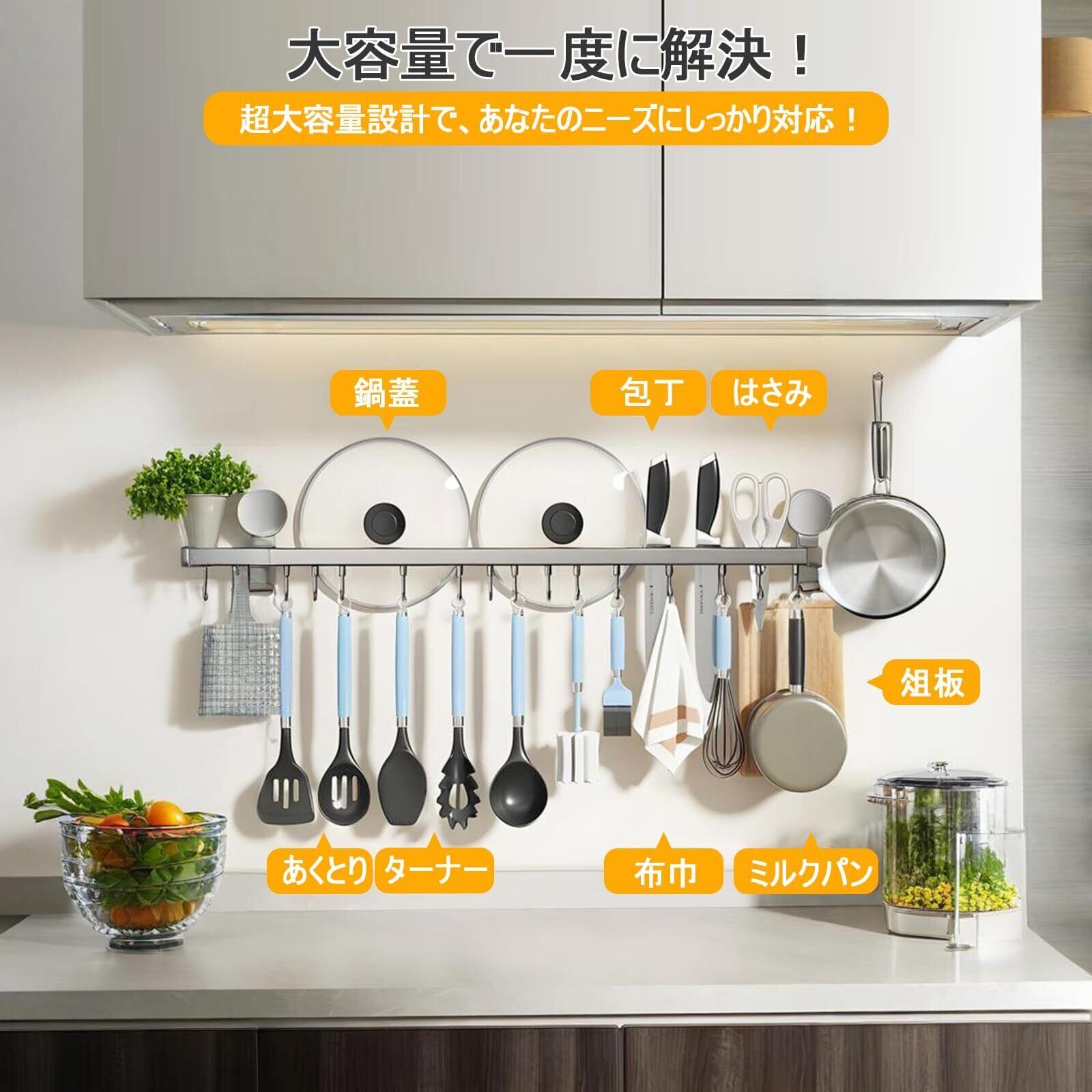 【可動式&多機能フックで自由にアレンジ】フックは左右スライド・増減自在。ふきん掛け/タオル掛け吸盤、鍋蓋掛け、フライパン吊るす、包丁ホルダーなど、調理器具収納からレンジフード下の吊り下げ収納まで幅広く対応。キッチン壁面収納をスマートに演出するウォールフックです。