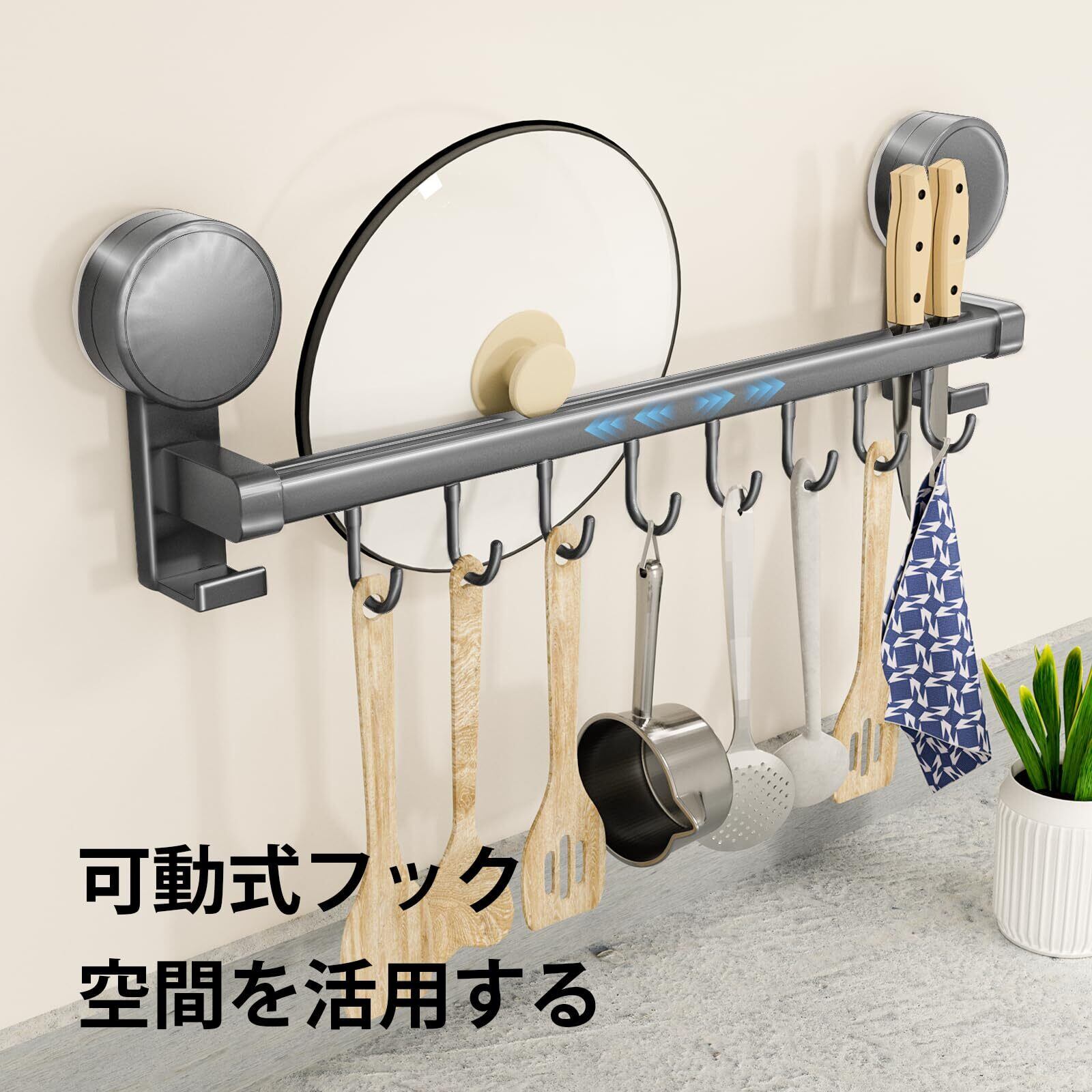 【取り付けが簡単】キッチンツールのフックは、壁面を掃除した後、指定の位置に吸盤を押すだけで簡単に取り付けられます。二重になっており、距離感を活かして収納力を高めています。フックは左右に動くので、物を弔るすのに便利です。簡単に取りつけられるので、キッチン収納の効率がアップします。