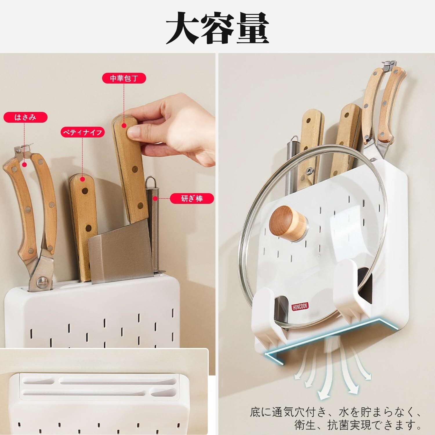 【商品仕様】サイズ:高さ21 cm,縦20cm,横4.2cm、収納本数:2-4本,バサミ専用穴1個、研ぎ棒専用穴1個 まな板収納/鍋蓋収納 *1重さ:約277g、素材:ABS樹脂