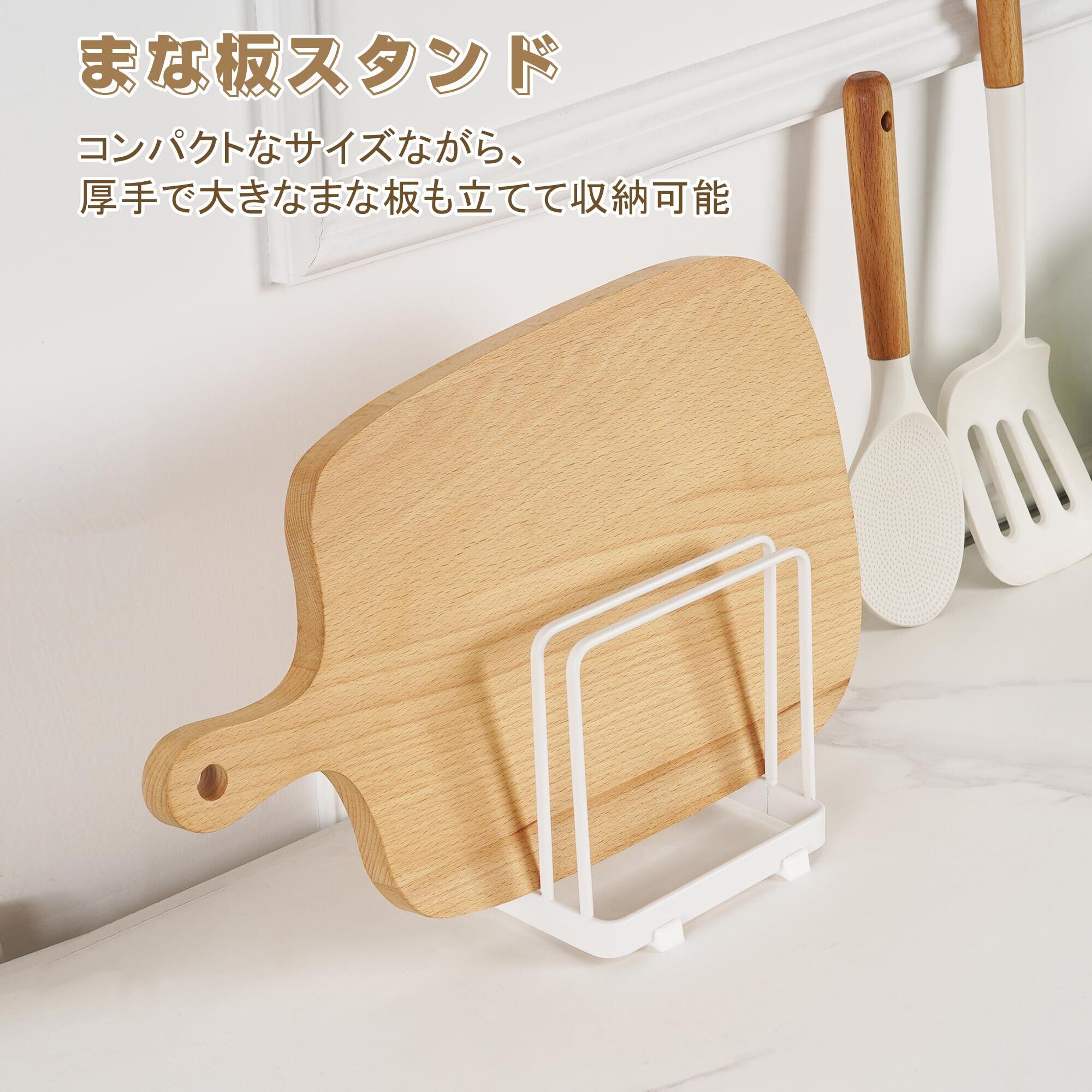 【多用途で柔軟に活用可能】まな板だけでなく、鍋蓋やフライパンの収納にも対応可能。さらに、キッチンクロスや小型の調理器具を干すこともできます。一つのスタンドで複数の用途をこなすため、キッチン整理がより簡単になります。また、用途に応じて異なるサイズの器具を効率よく収納できるフレキシブルなデザインが魅力です。