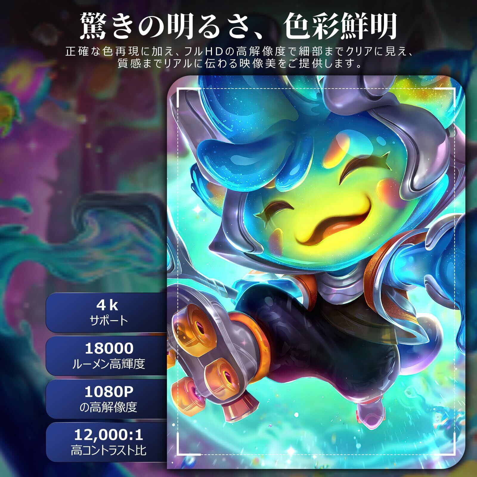特徴 18000ルーメン高輝度 4K対応, 270度回転, Android TV搭載, Bluetooth5.4 & 高音質HI-FIスピーカー内蔵, Wi-Fi内蔵