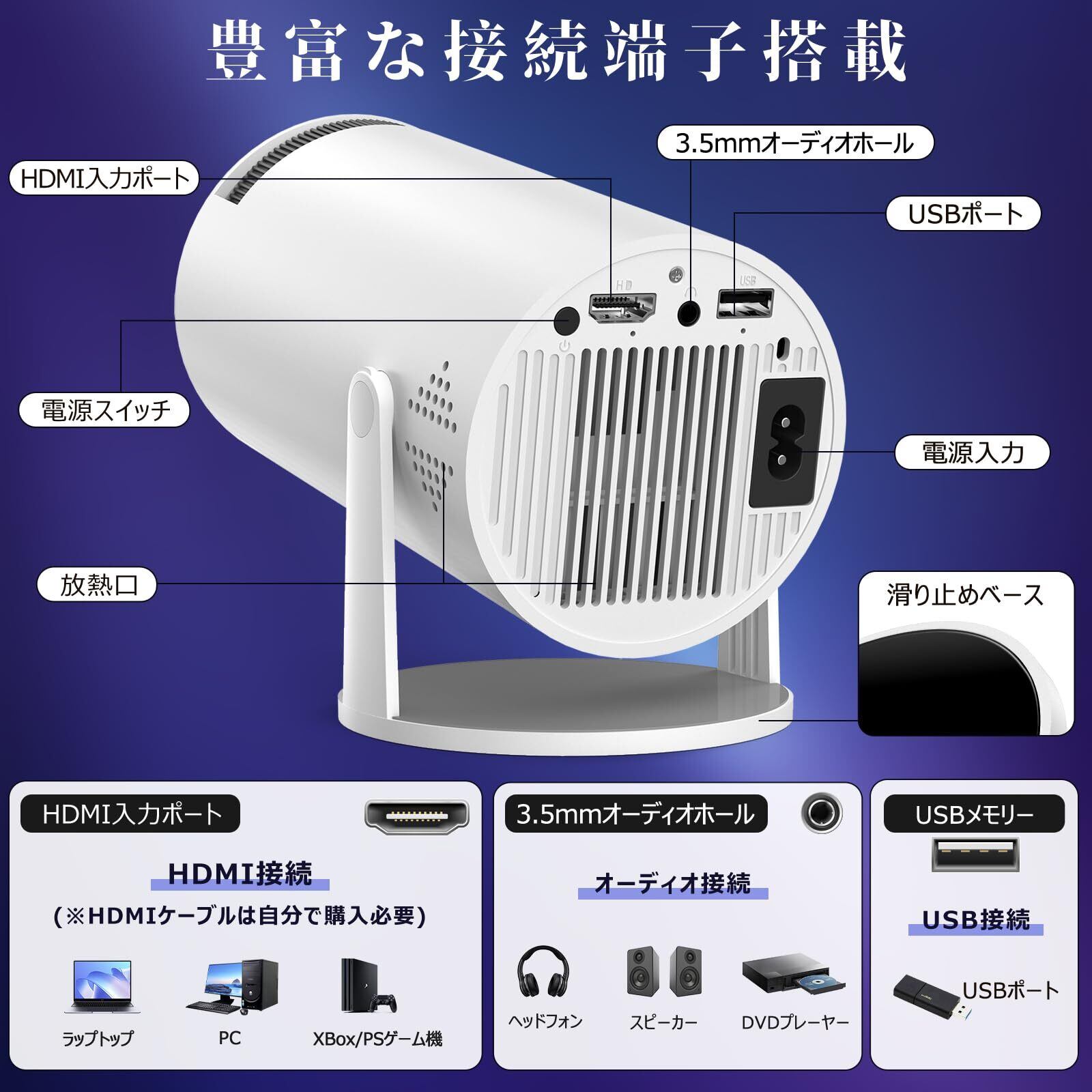 【様々なデバイスに兼用&超長い寿命&省エネ】無線でも有線でも接続する家庭用プロジェクターはWi-FiとBluetooth接続に加えて、HDMI、USB、3.5mmオーディオポートも装備しており、PC、DVDプレーヤー、タブレット、USBストレージ、PSゲーム機、スピーカー、ヘッドフォンなどと互換性があります。 また、超小型プロジェクターは革新的な冷却ファンが採用されて、排気口も設置し、放熱効果が良くて80,000時間以上の超長寿命を実現しており、安心してご使用いただけます。ご使用中に何かご不明な点がございましたら、お気軽に弊店ご連絡ください。(パッケージ内容:プロジェクター本体、リモコン(単4形乾電池×2本 ※別売り)、電源コード、日本語説明書)