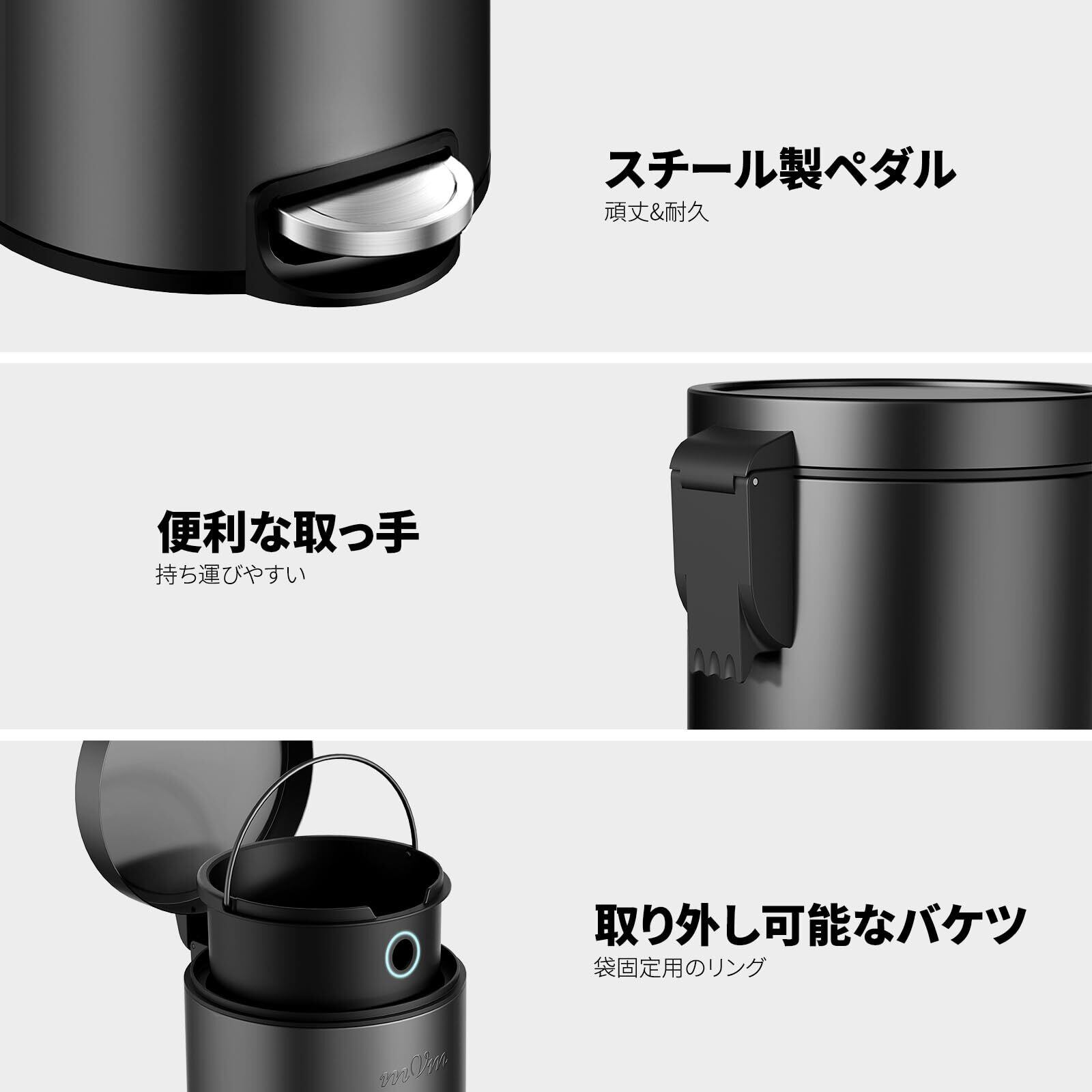 【数量限定】mVm ゴミ箱 ふた付き 5L容量 おしゃれ ステンレス ダストボックス 静音 ペダル式 キッチン リビング 洗面所やトイレ隙間用 オフィス用 丸形 ブラック
