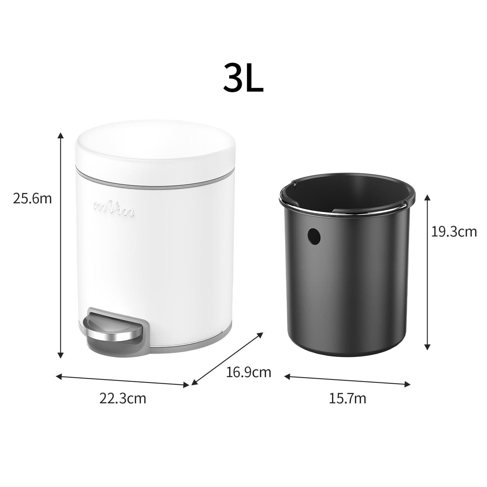 mVm フタ付き ゴミ箱 3 L ペダル式ステンレス スリム おしゃれ ダストボックス 密閉性 キッチン リビング 洗面所隙間 オフィス用 袋が見えない 頑丈 耐汚 丸形 ホワイト