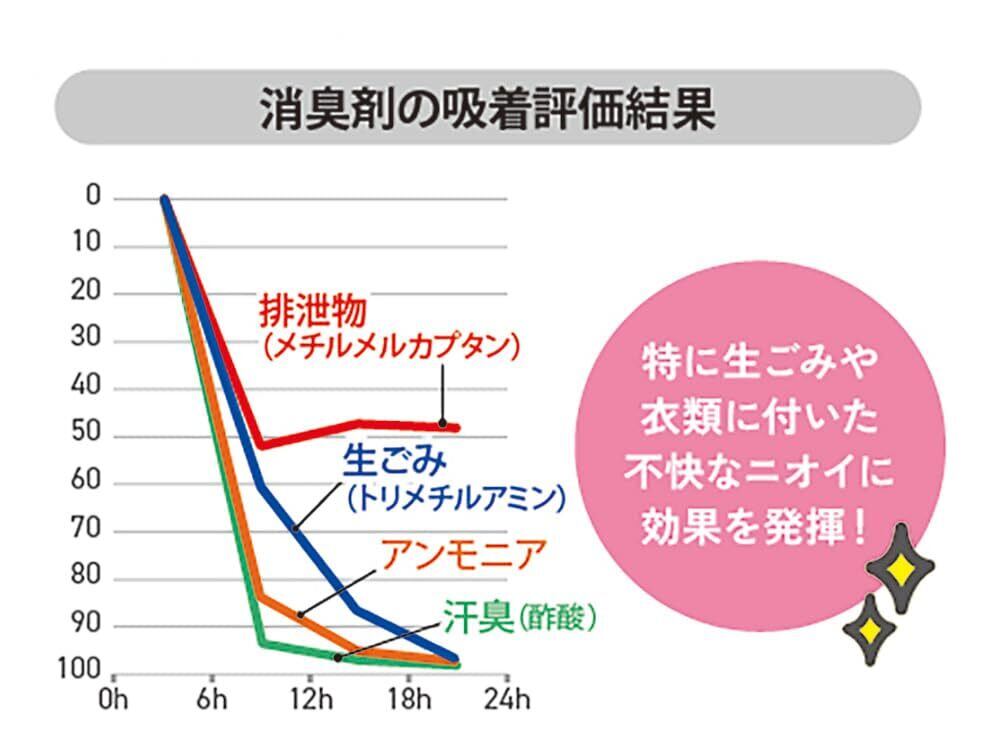 ●特に生ゴミ(トリメチルアミン)や汗臭(酢酸)などに高い効果を発揮します。