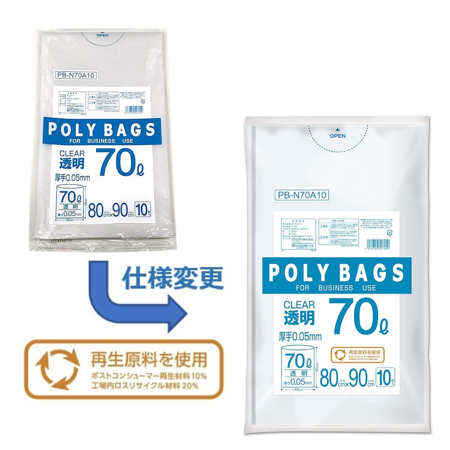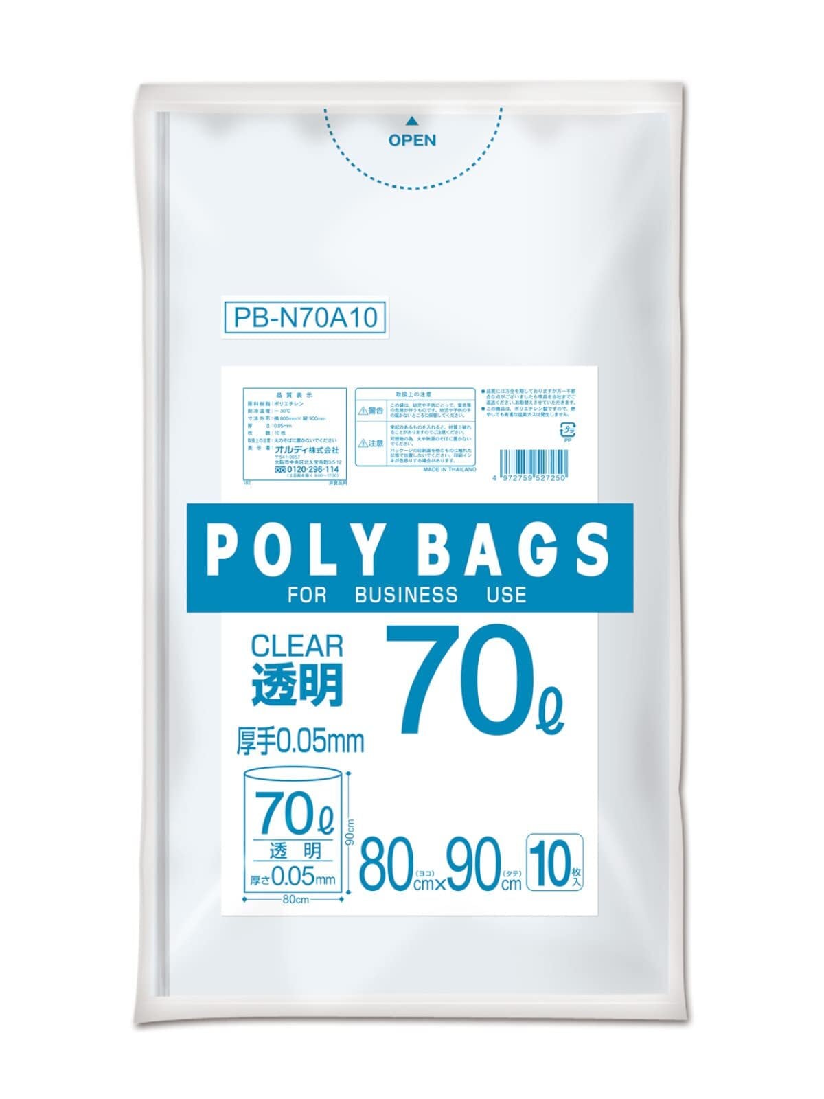 オルディ ごみ袋 70L 厚手 透明 10枚入 縦90cm×横80cm ツルツルした手触り ポリバッグビジネス PB-N70A10