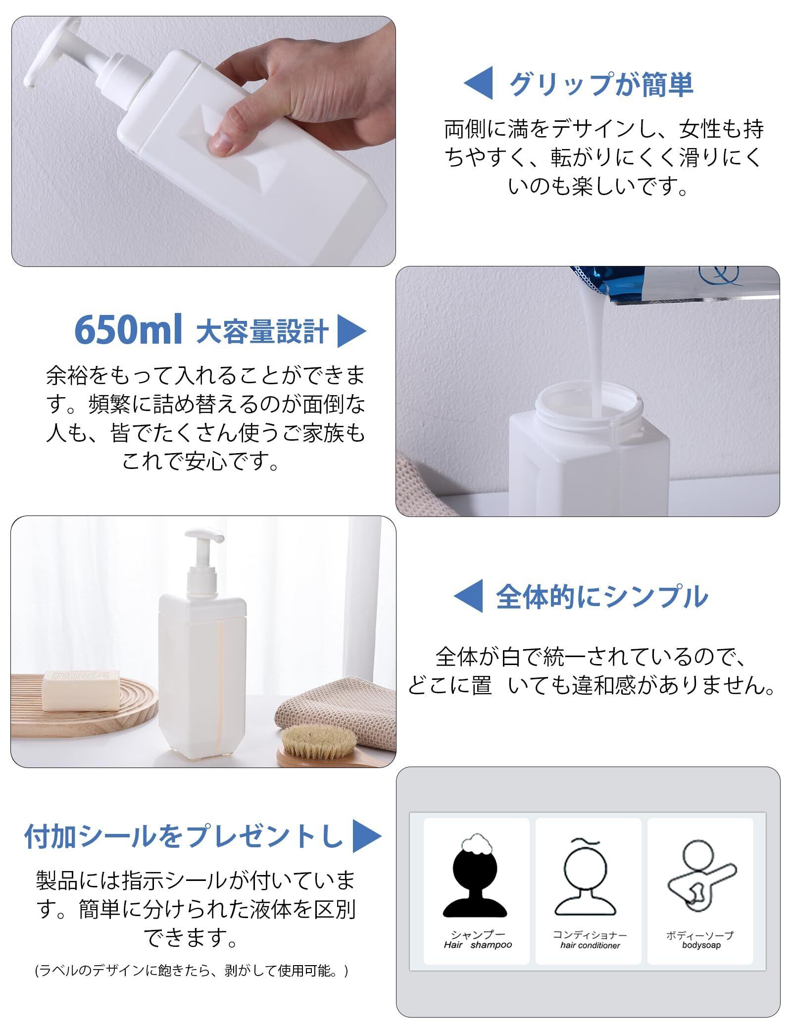 JBM シャンプーボトル ディスペンサー 詰め替えボトル 広口 大容量 おしゃれ ホワイト 650ml 3本セット シール付き