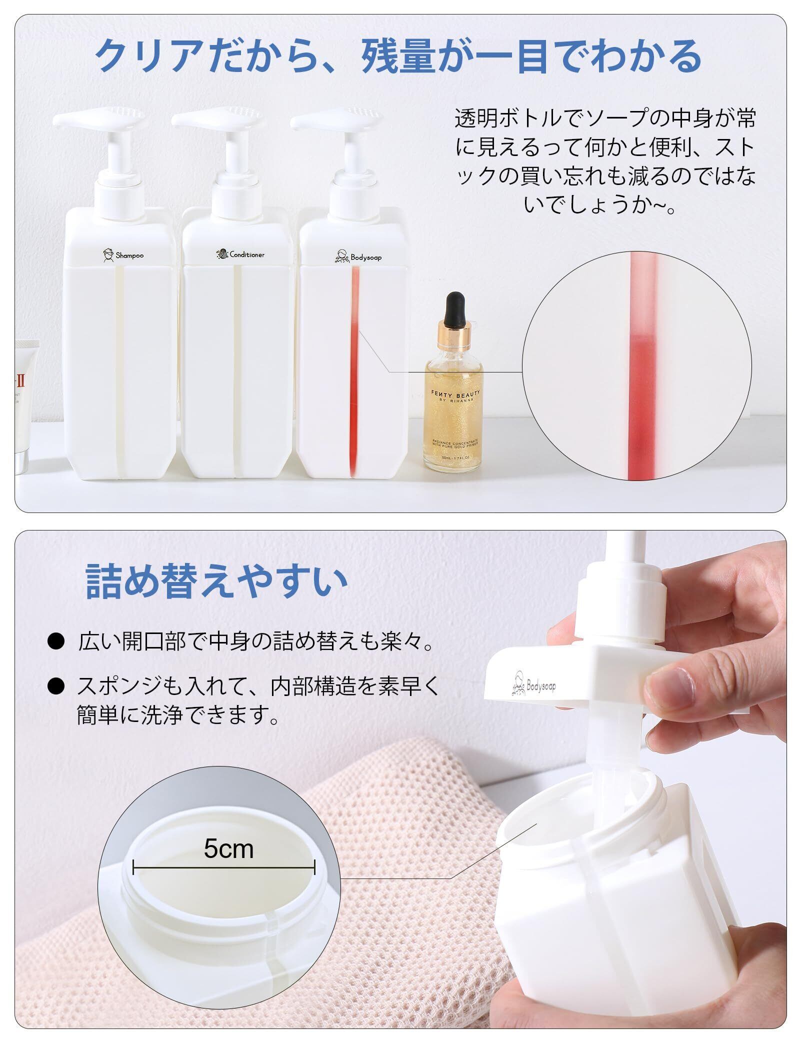 【5cmの広口設計】広口設計で、液体をこぼさずに注ぐことができ、洗浄が簡単です。 小袋シャンプー 詰め替えはそのままボトルに入れられます。 オリジナルステッカー(シャワージェル、コンディショナー、シャンプー)と滑り止めシールが付属します。