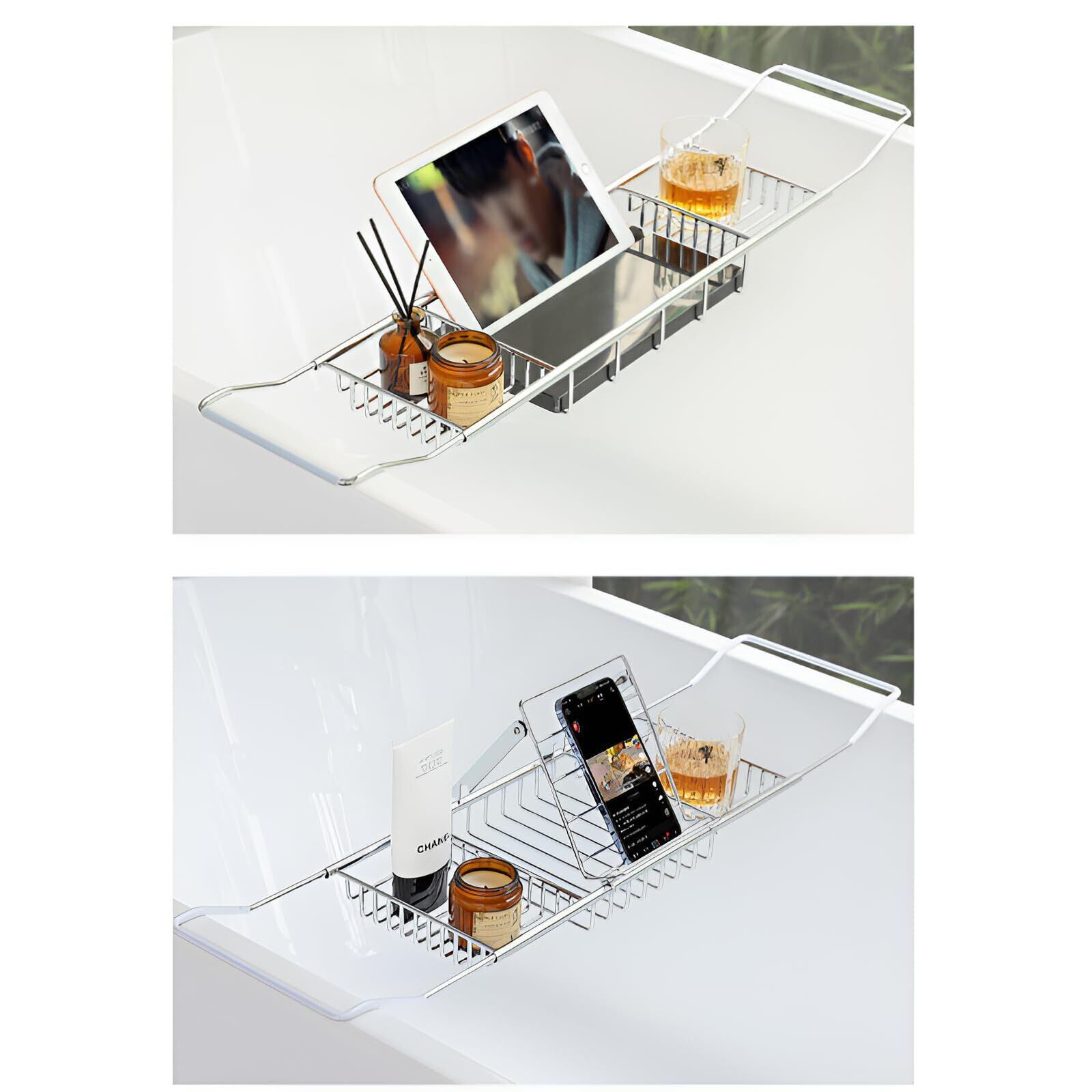 [JUELREOU]お風呂 伸縮トレー ステンレス製 62-98cm 錆びにくい カビない バステーブル バスタブ バステーブル お風呂 机 浴室収納 お風呂雑貨置き台(なし本棚)浴槽ラック バステーブル
