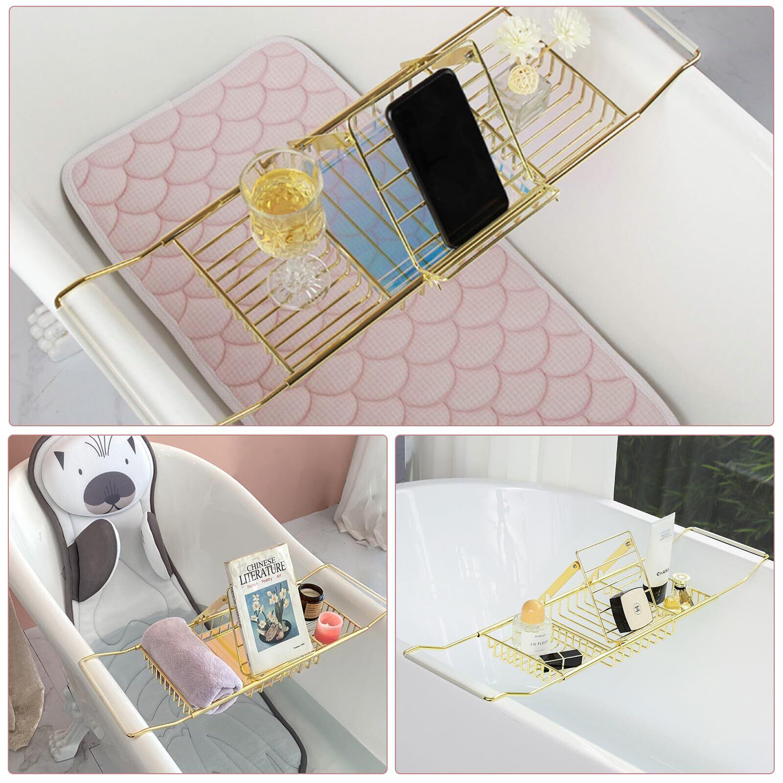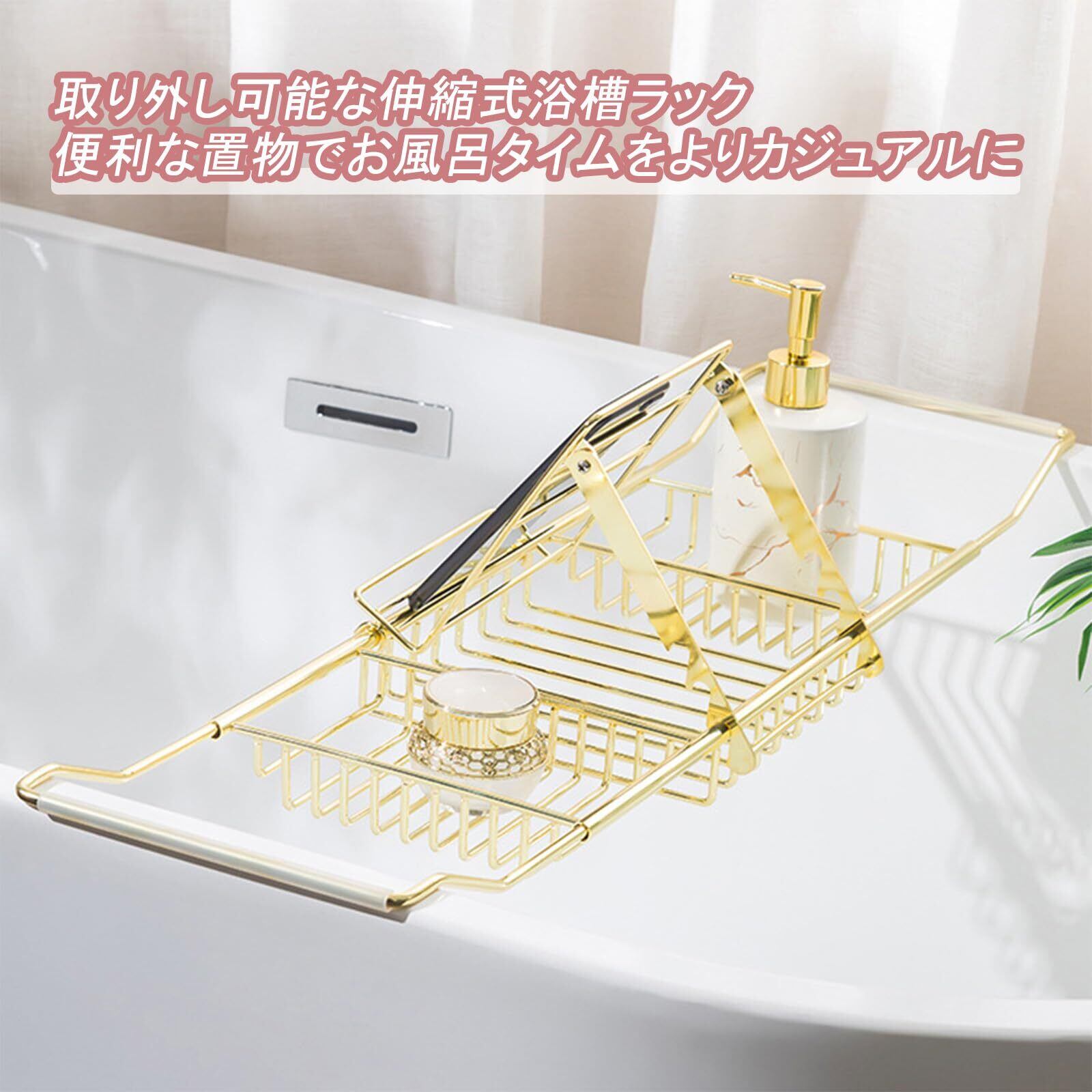 バスタブトレー バスブックスタンド 伸縮式可能 お風呂 トレー のんびりお風呂 バスグッズ 浴槽ラック 浴室収納 お風呂雑貨置き台 バスタブ 携帯スタンドお風呂 テーブル (ゴールド)