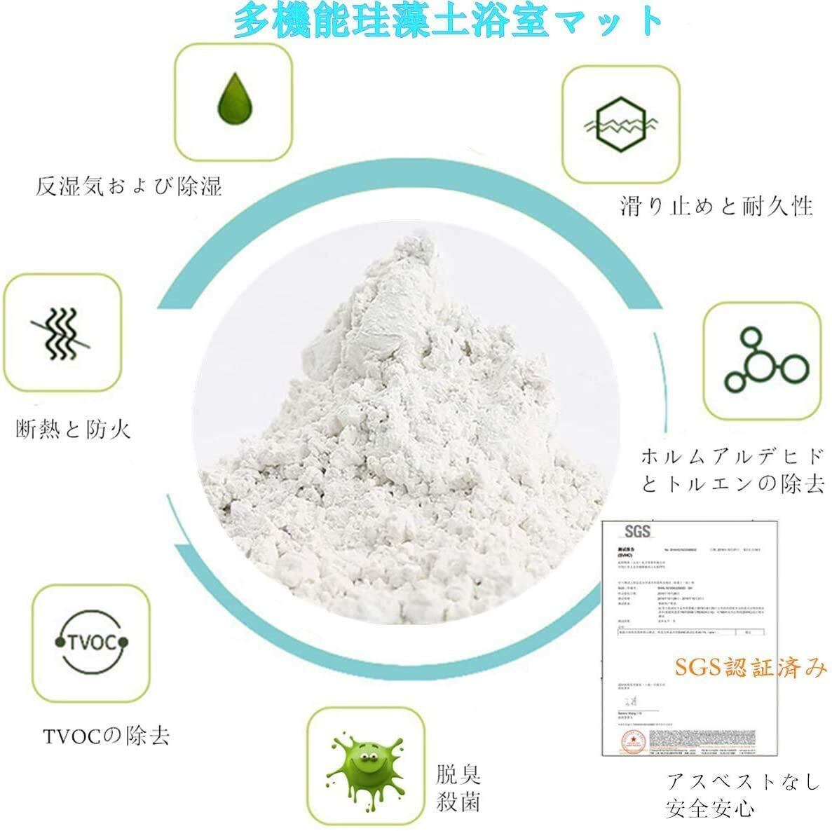 【抗菌材質・消臭効果】「調湿」機能で不衛生なバイ菌やカビ菌、ダニなどの繁殖を防ぐことができ、室内のいやな臭いを吸着「消臭作用」も持っています。そのおかげで、浴室、脱衣所、洗面所、キッチンや玄関など、活躍場所は家の中にたくさんあります。また、使用回数や経年変化により表面の目が詰まり、吸水力が低下することがあります。その場合は、付属の紙ヤスリまたは市販の紙ヤスリで表面を軽く磨くと、吸水力を回復させることができます。