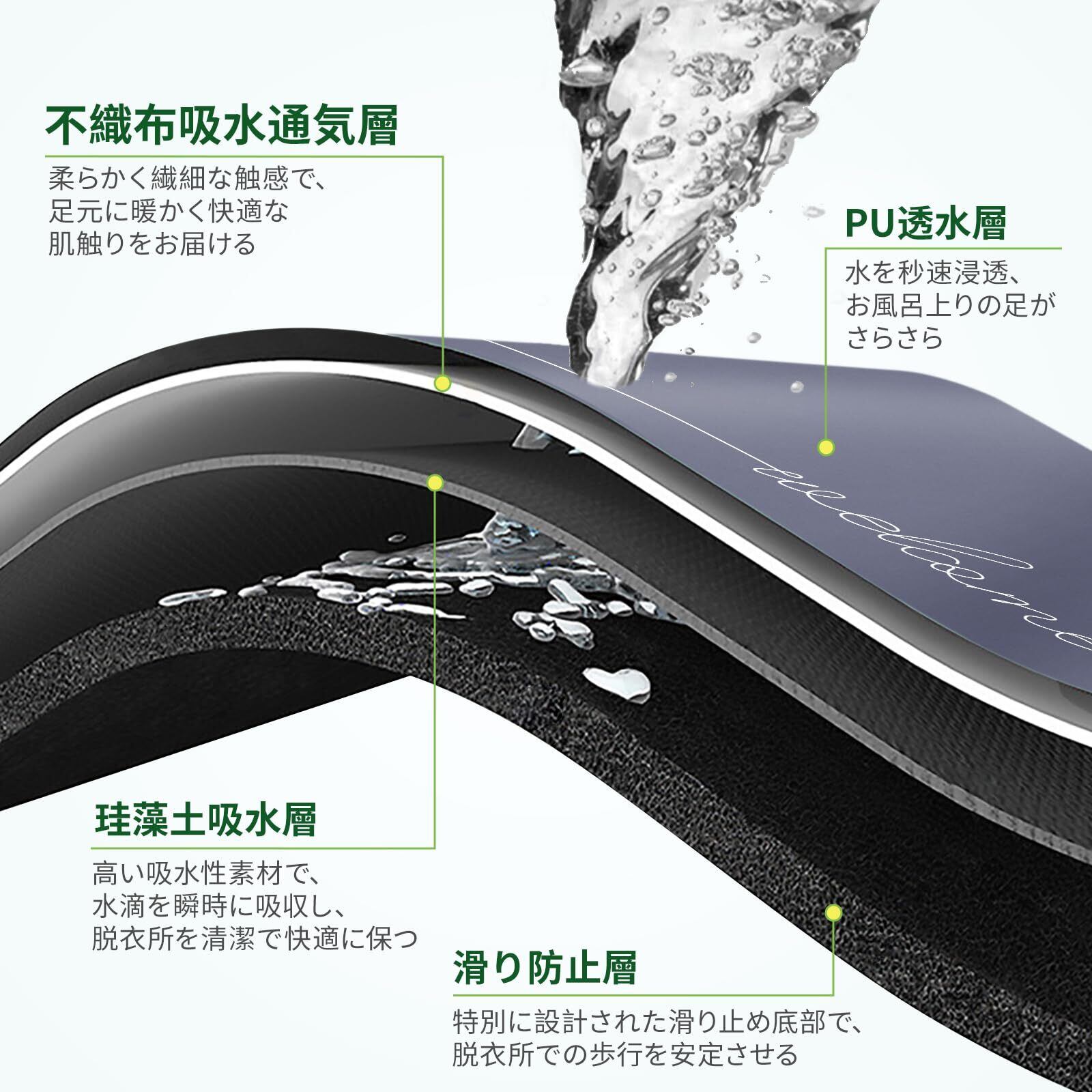 【珪藻土+不織布・速乾吸水UP】ソフト珪藻土バスマットは珪藻土の優れた吸水性を持ち、お風呂上がりの水分をしっかり吸収できます。不織布層の通気性と透水性が優れ、珪藻土層の吸水量も抜群!お風呂上がりの濡れた足の水分を素早く吸収し、無数の小さな穴から水分を短時間で蒸発させます。心地よいお風呂上がりを、さらに快適で爽快な気分にしてくれる。