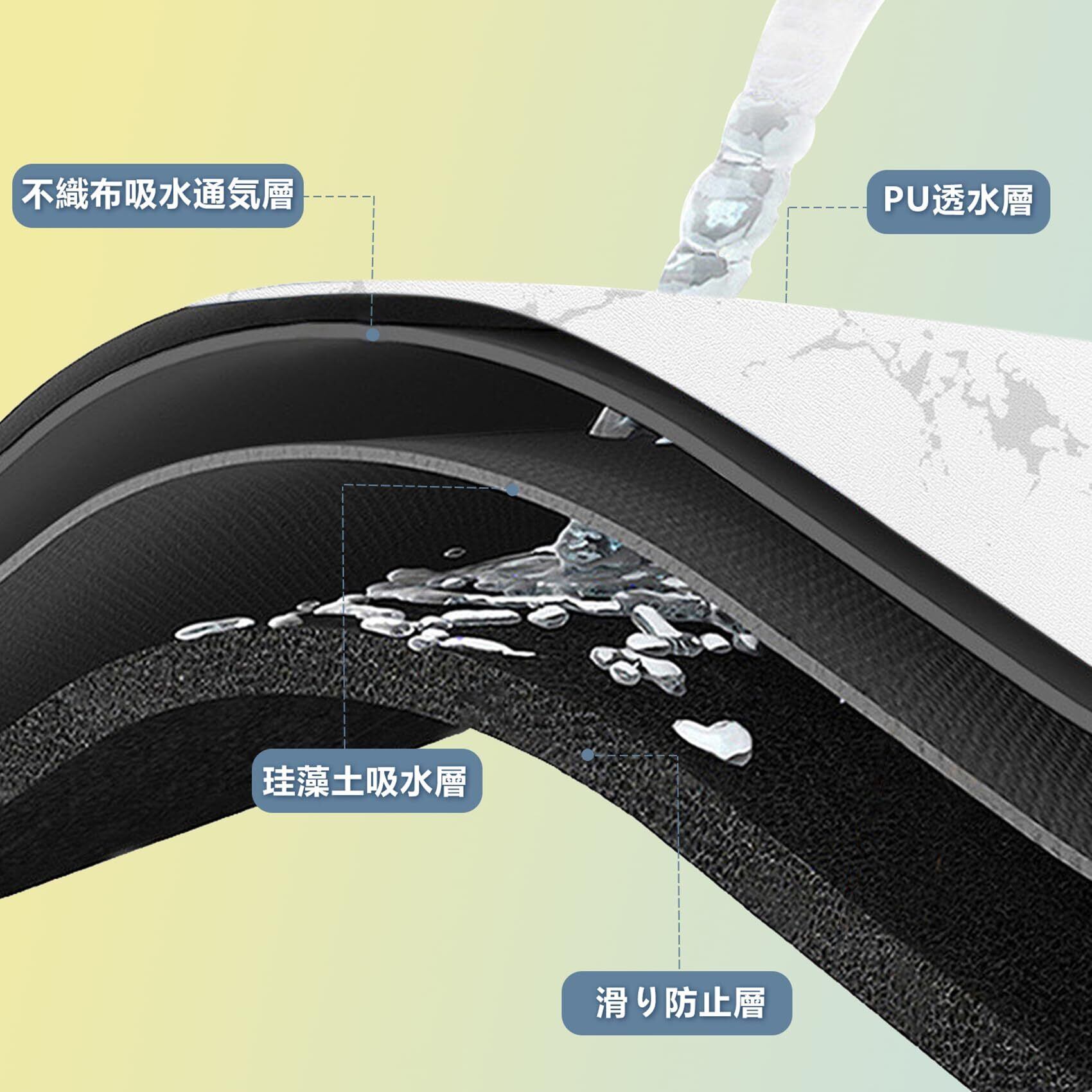 【吸水性・速乾性】ソフト珪藻土バスマットは 吸水力に優れ、お風呂上りの濡れた足元の水滴を逃さず、すばやく吸い取りします。超極細繊維PU透水層は通気性が良く、表面の水分が急速に蒸発し、速乾性に優れているので、湿気による細菌の繁殖も抑えます。