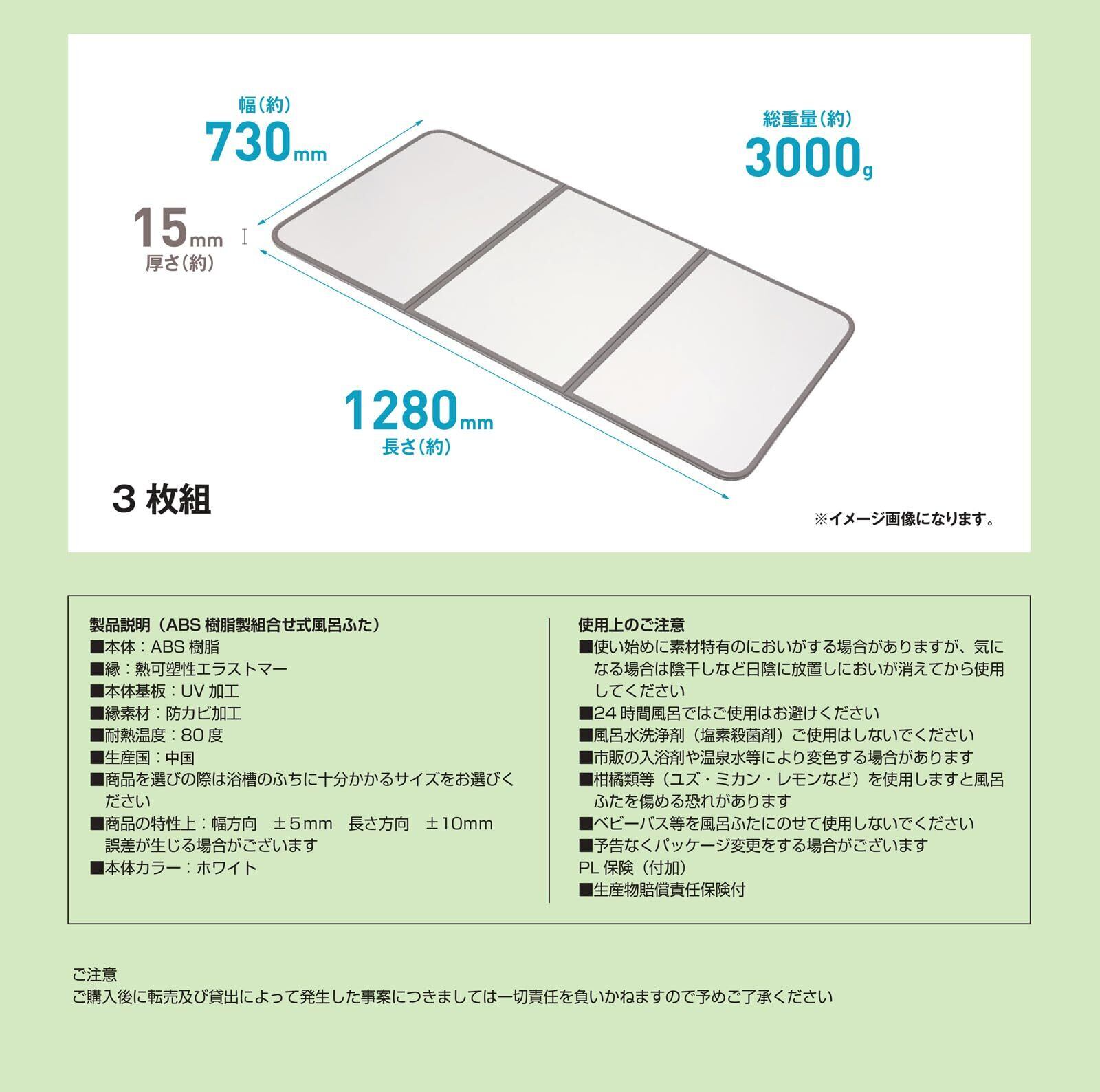 色:ホワイト | サイズ:73×127cm 組数 (3枚組) ■使い始めに素材特有のにおいがする場合がありますが、気になる場合は陰干しなど日陰に放置しにおいが消えてからご使用ください ■風呂ふたを洗う時には中性の浴槽洗剤をご使用ください ■汚れ落としに塗料用のシンナー、塩素系の洗剤、漂白剤、カビ取り剤、および歯磨き粉、固いたわし等は、風呂ふたを傷めますので絶対に使用しないでください ■いつも濡れたままの状態ではカビが発生しやすくなります。ときどき陰干しをしてください ■一部の入浴剤や温泉水等により変色する場合がありますのでご注意ください ■風呂水洗浄剤 (塩素殺菌等) 、浴室用洗剤 (アルカリ性等) によって風呂ふたが傷んだり、変色、劣化しますので使用しないでください ■塩素系殺菌、浴槽水浄化保温装置 (24時間風呂) にご使用されますと風呂ふた表面の荒れ、退色などの変化を生じるおそれがありますので、ご使用をお避けください ■風呂ふたの上にベビーバスなどを乗せて使用するのは大変危険です。絶対にやめましょう