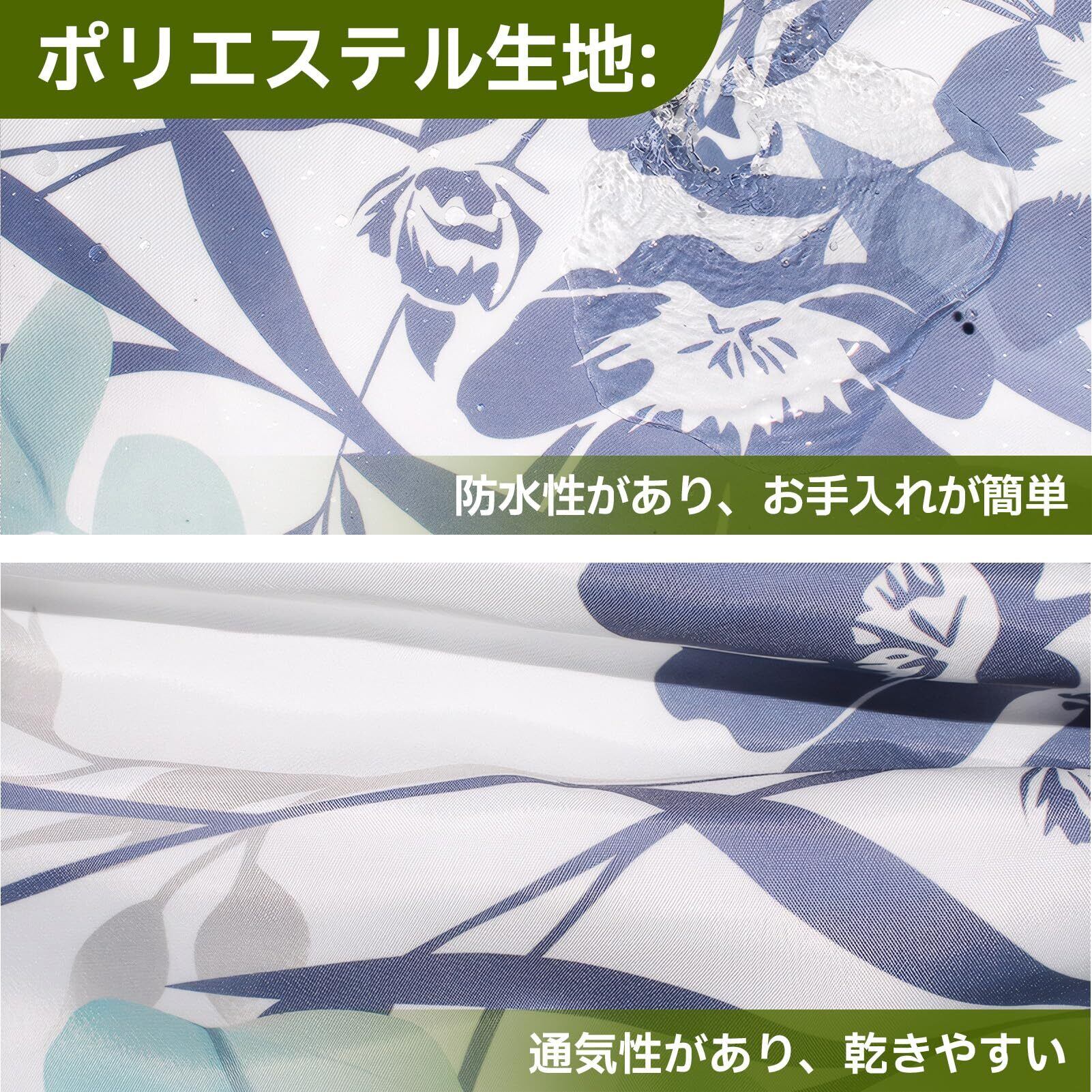 [高品質のポリエステル素材、優れた防水性能]: このバスカーテンは高品質のポリエステル素材を使用しており、優れた防水性能を備えています。これにより、浴室が濡れることを防ぎ、常に乾燥状態を保つことができます。また、この素材は耐久性があり、清掃も簡単です。