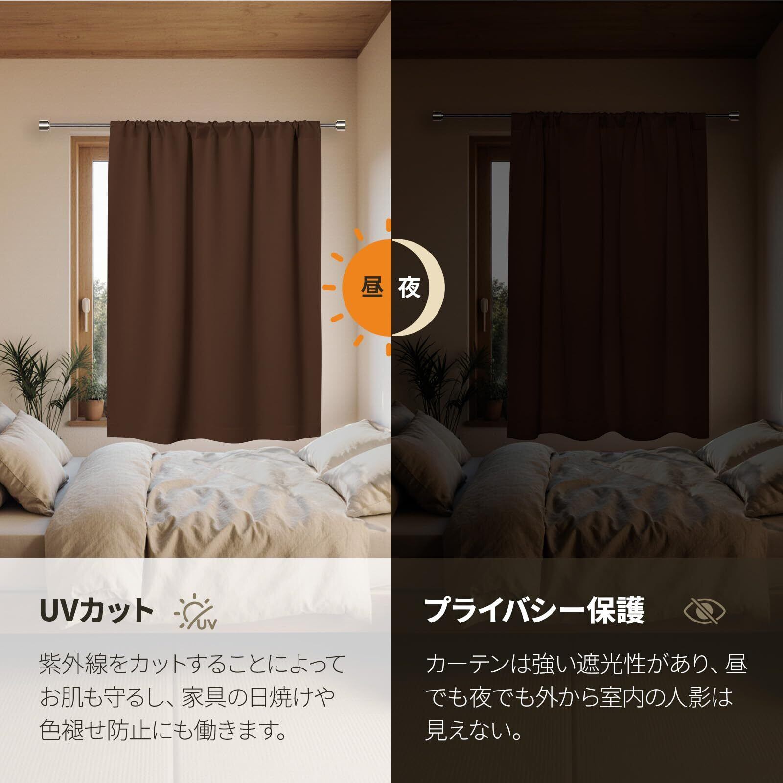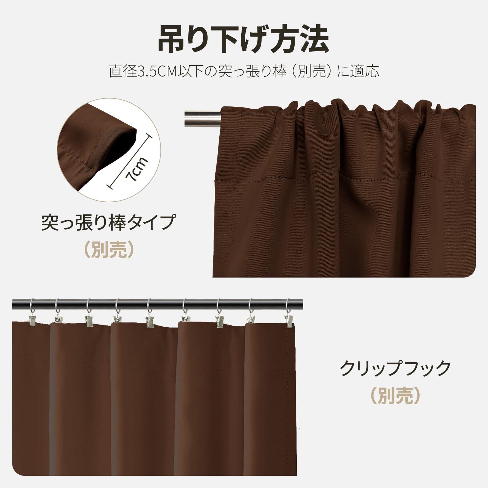 【取付方法】両端の直径3.5cm以下の突っ張り棒(別売)が使用可能です。※ご注意:対応可能な突っ張り棒を自分でご用意ください。カラー:ブラウン<遮光1級> 幅100cmx丈110cm <1枚入り> 適応窓サイズ:幅55-95cm