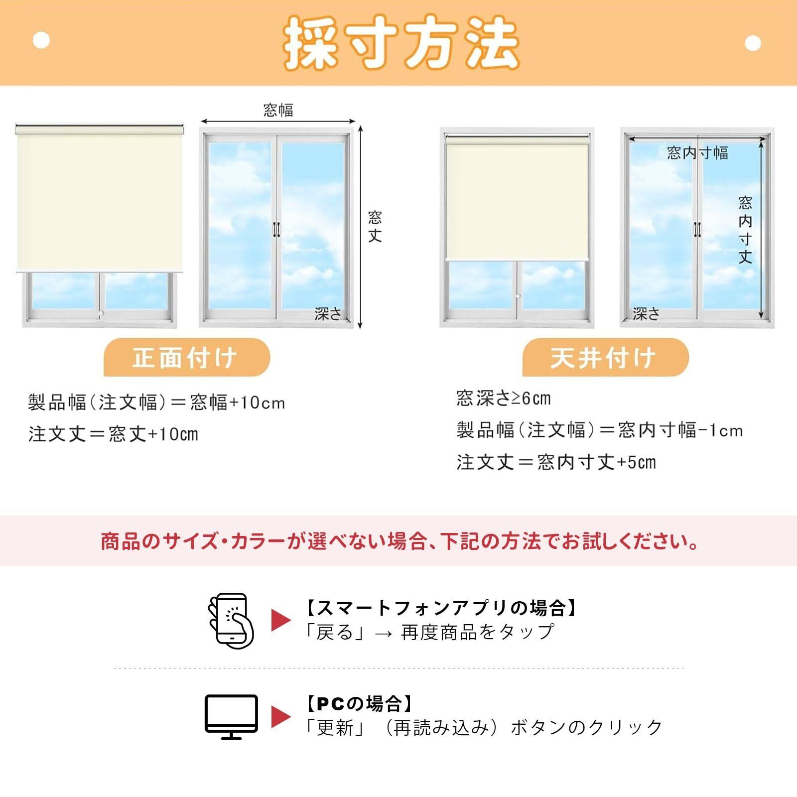 「サイズオーダー方法」:当社で提供するプルコード式ロールスクリーンでは、0.1cm単位でオーダーが可能です( 45cm≤幅≤230cm、 30cm≤丈≤300cmの範囲内)。ご注文後は「注文履歴」の「出品者に連絡する」または「注文に関する問題」ボタンよりご連絡をお願い致します。ご連絡が無い場合、既定のご注文サイズでの手配となりますのでご注意ください。もし、ご希望のサイズがオーダーサイズ設定にない場合には、お気軽にメールで弊社までお問い合わせください。