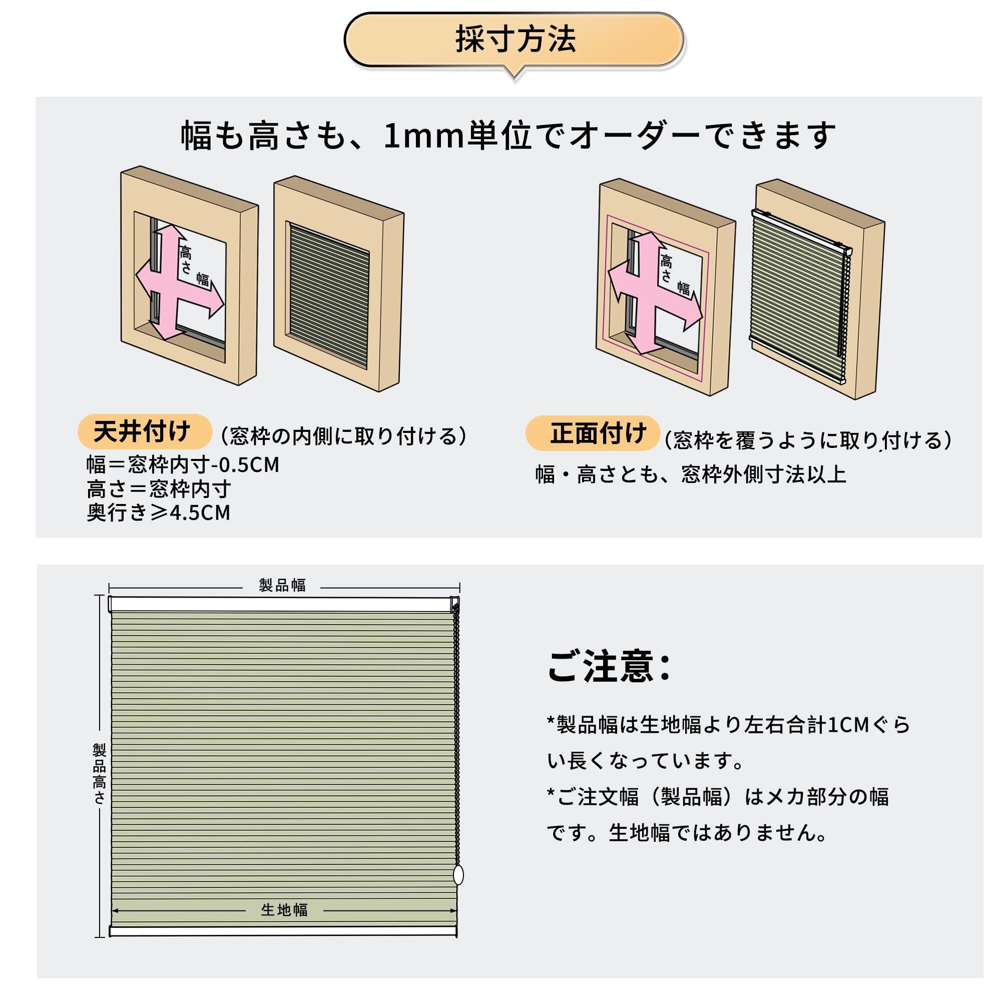 「サイズ選び」 商品のご注文サイズは製品本体のフレーム部分の大きさも含めたサイズになります。窓枠の内側に設置される場合、横幅は窓枠内側の寸値になります、窓枠の外側に設置される場合、横幅は窓枠外側の寸値(窓枠を隠したい場合には+5~10cm)になります。 ※注文サイズは生地のサイズではございません。