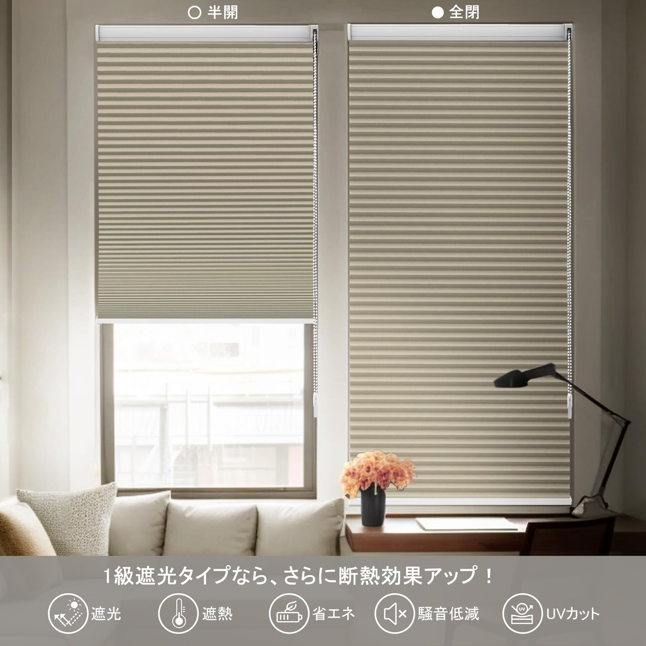このハニカムシェードは、優れた遮熱および防寒機能を実現します。夏は強い日差しをカットし、冬は暖かい空気を逃がさず、冷気をブロック。さらに、UVカット機能も付いているため、大切な家具やインテリアを紫外線から守ります。