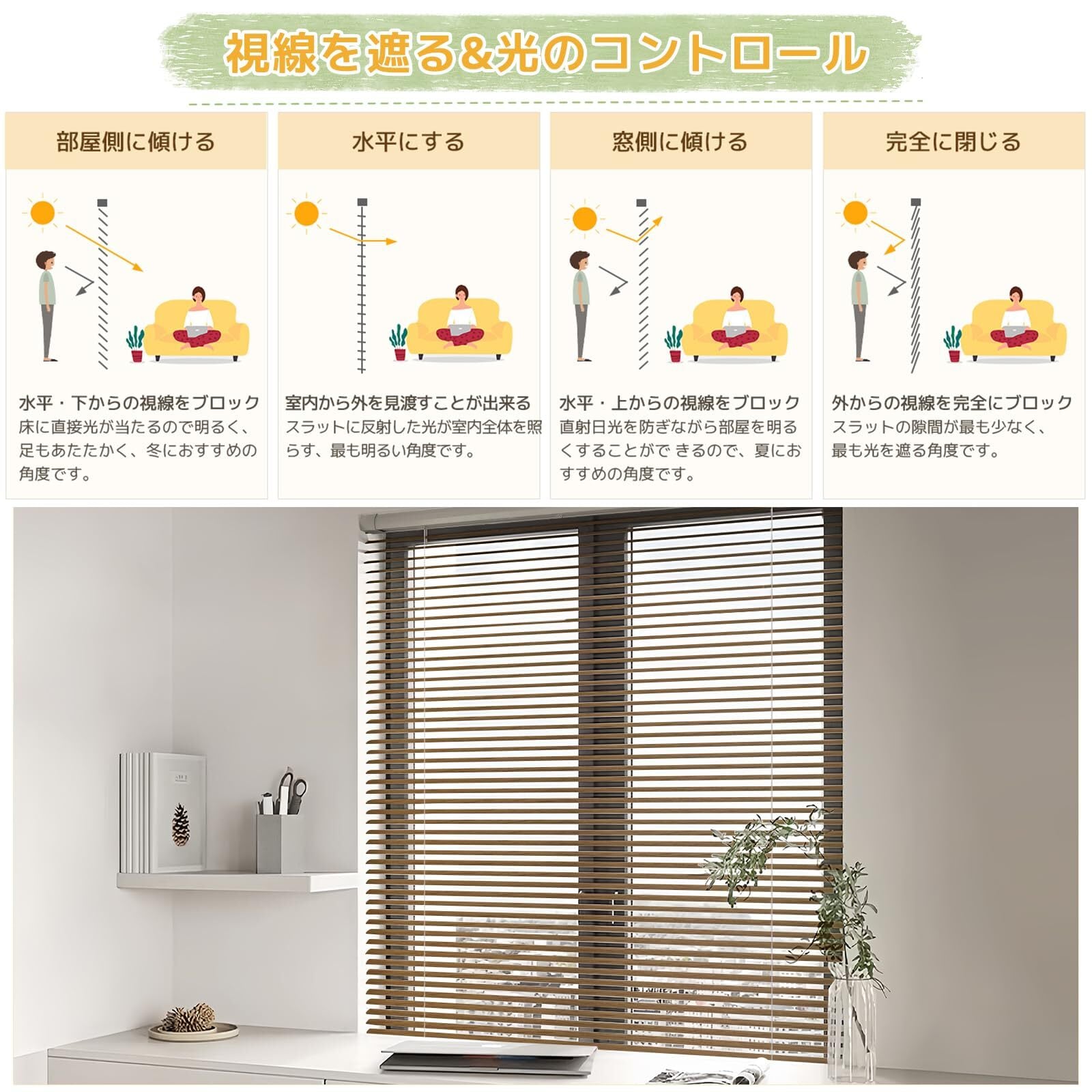 「チェーン式で調光機能」:チェーン式タイプで、止めたい高さを細かく調節できます。チェーン位置が右側か左側かを選べます。普通チェーンは右側位置を手配します。左操作ご希望の場合は、メールで当社と連絡してください。スラットの角度が上下180°調整可能です。採光性が高く、スラットを閉じた状態でも日の光を取りこんでくれるため、直射日光を遮りつつもお部屋が明るくなります。