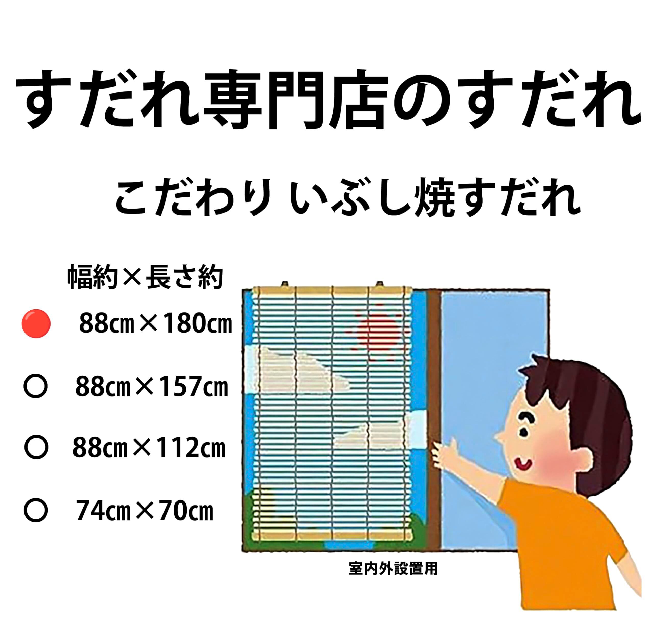 このこだわりいぶしすだれは、88×180㎝のサイズで、厳選された天然黒丸竹を使用しています。美しいブラウンの色合いが心地よい和の空間を演出し、夏の暑い日差しからしっかりとお部屋を守ります。自然の風を取り込みつつ、遮光性にも優れたこのすだれは、快適な暮らしをサポートします。