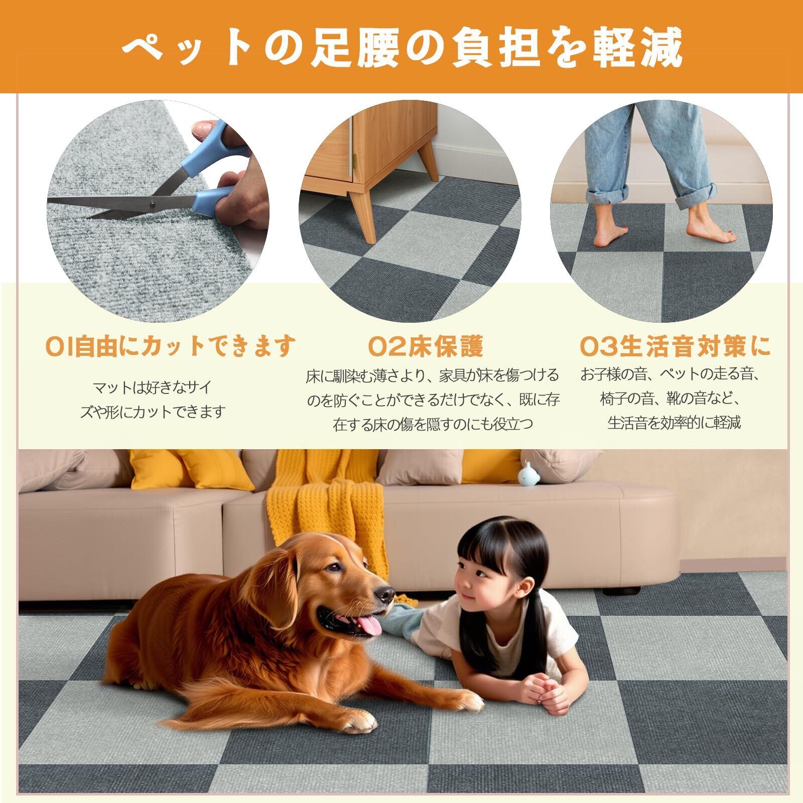 【ジョイントマット 吸着マット】タイルカーペット底部の特殊構造が吸盤のようにくっつき、カーペットを叩いても動かず、どの床にもしっかりと吸着します。ペット連れのご家族、お子様、お年寄りに最適です。このリビングフロアマットの各ピースのサイズは約45x45cm、厚さ:4mm、表面はポリエステル、背面はTPRで、床に接着できます。