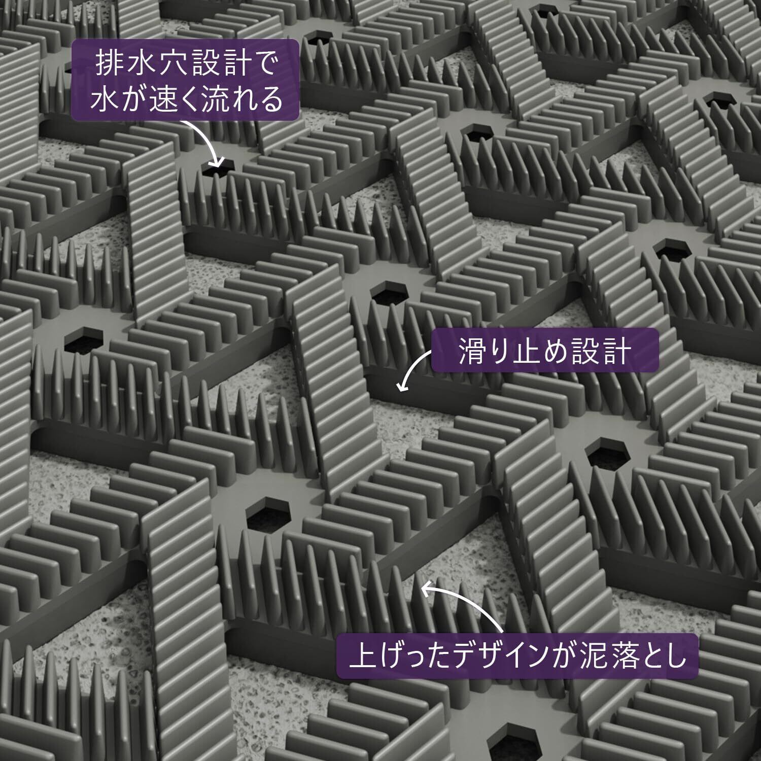 靴底に付いた泥や水をしっかりとキャッチできる凸凹構造を採用しており、靴から落ちた汚れを効果的に取り除きます。この機能により、室内の床を清潔に保ち、訪問者を迎える準備を整えます。