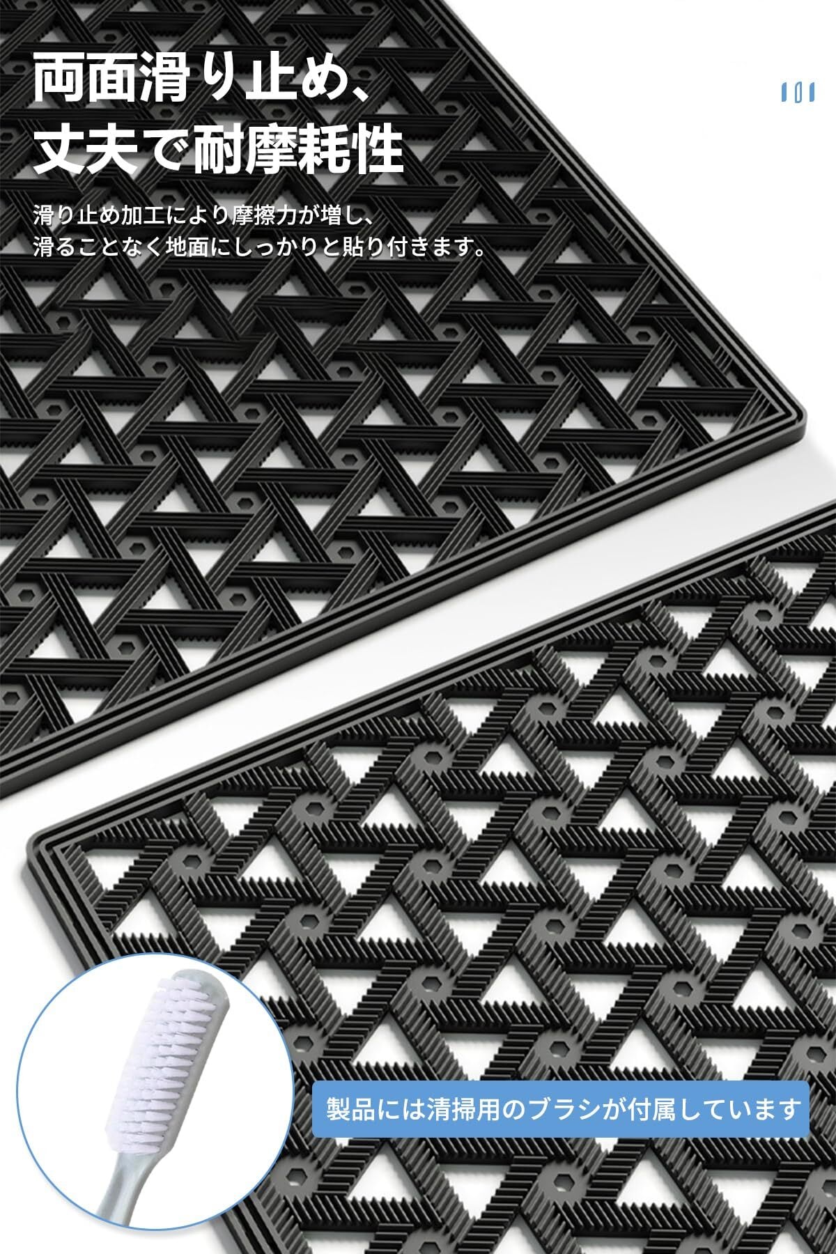 付属のクリーニングブラシを使用することで、マットの手入れが簡単に行えます。普段の清掃はもちろん、頑固な汚れも手軽にお手入れできるため、常に清潔な状態を維持できます。