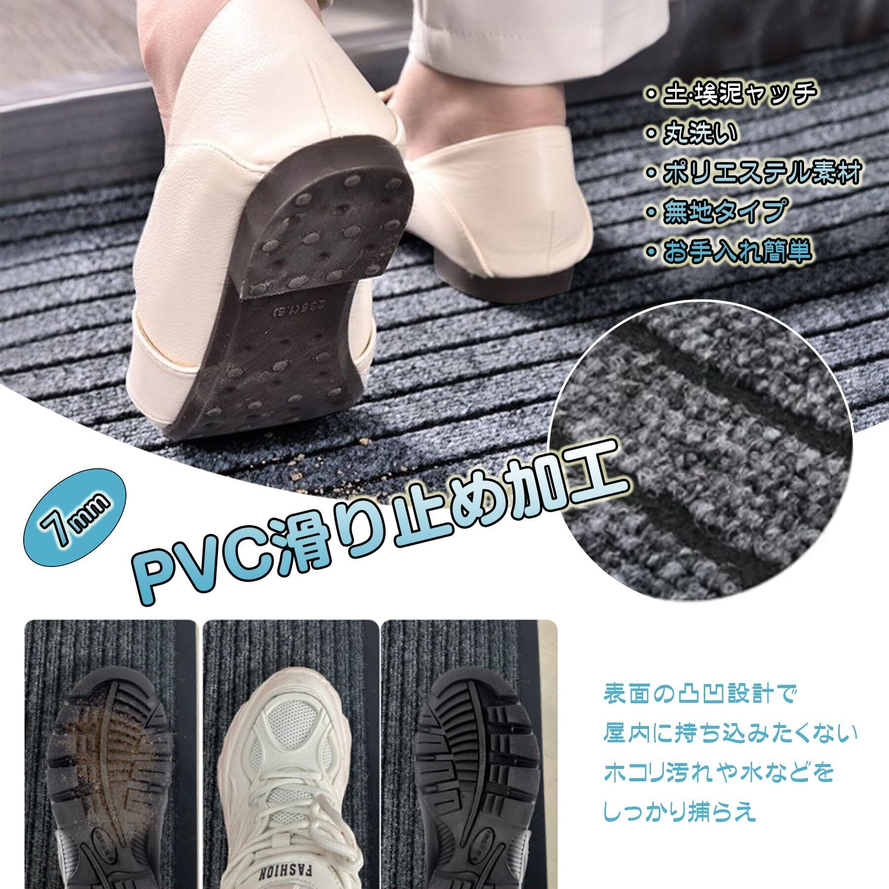 【使う場所を選ばない玄関マット。シンプルかつ高品質】多用途マットです!ドアマット、階段マット、玄関マット、キッチンマットなどのインテリアマット等、様々な使い道でご利用いただけます。飲食店や美容院、学校、公共施設、レジャー施設といった店舗など、業務用として最適です。タイル張りのポーチ、ビル階段の下や、エレベーター前、店舗の店先など、お客様が雨天で滑りやすい場所でも、高い吸水性能で効果を発揮します。一般の住宅の玄関外にマットを置くことで玄関の高級感がワンランクアップします。雪の多い地域にお住まいの方には、雪対策として、玄関内で雪落とし用にもおすすめです。毛足の強さがしっかりしているので長靴の底に付いた雪もしっかり落とせます。