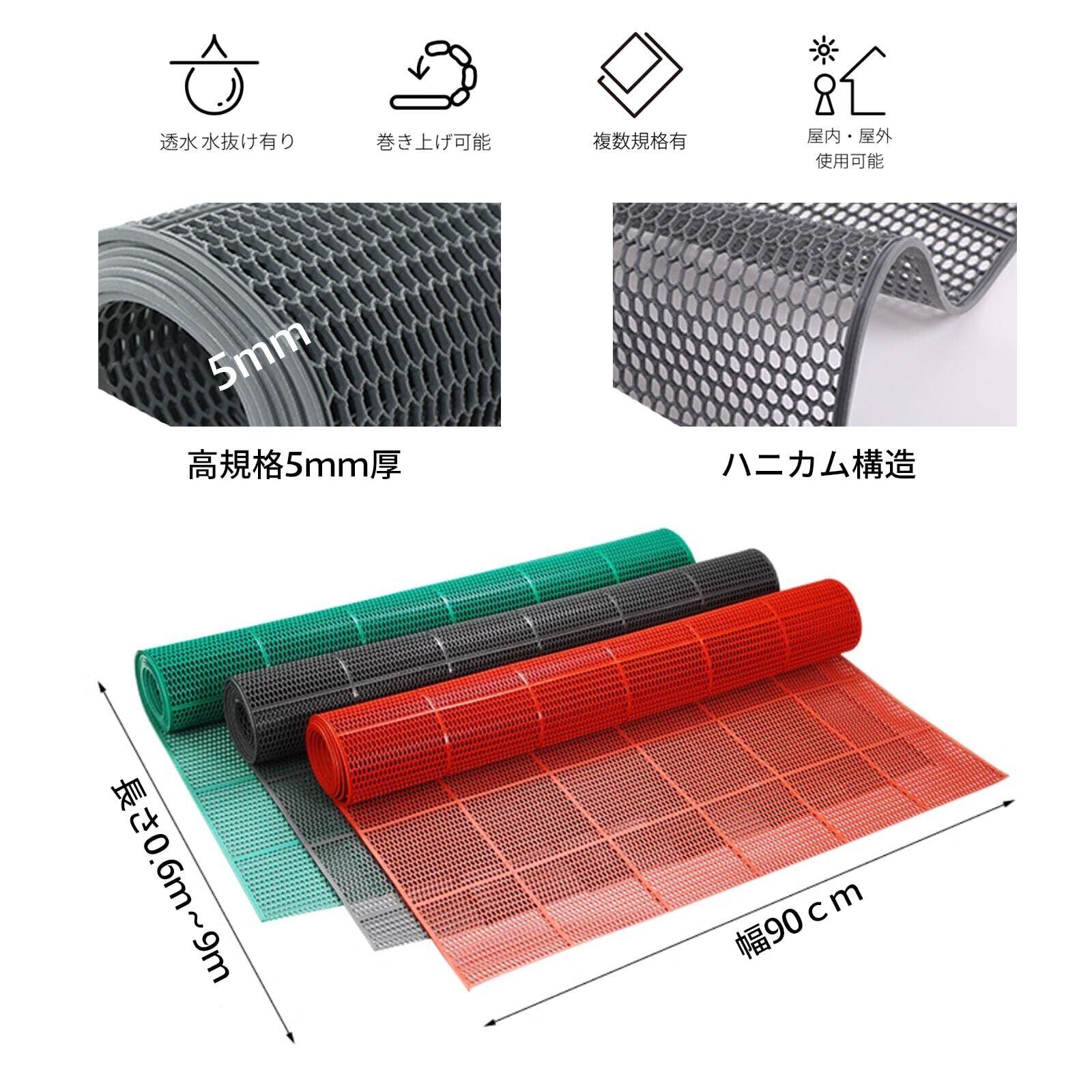 仕様:厚さ5mm、幅90cm、長さ0.6m、1.5m、3m、6m、9mの複数のサイズと、グレー、レッド、グリーンのカラーバリエーションを用意。ハサミでお好みのサイズにカットできます。家庭用から業務用まで幅広いシーンに対応します。