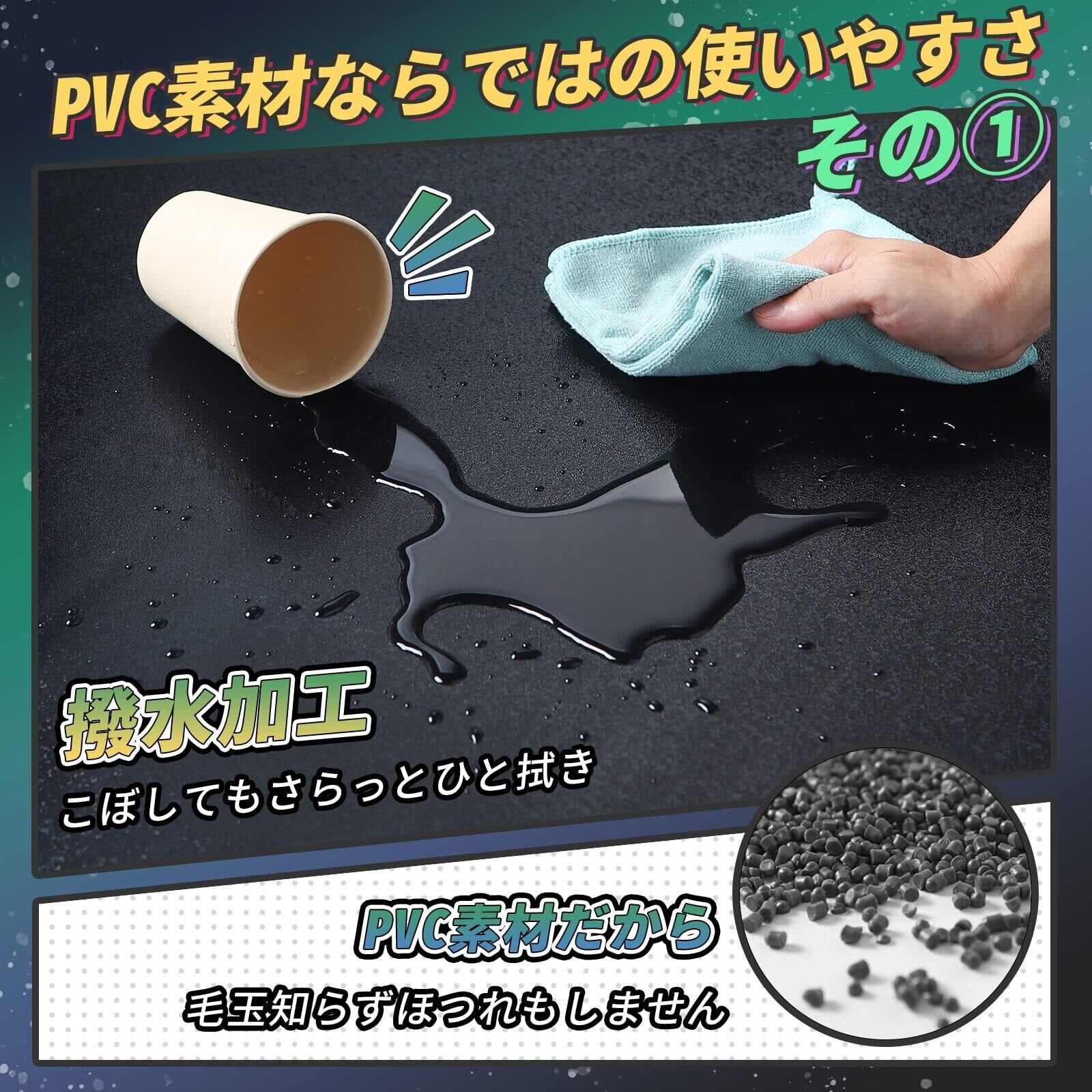 【撥水加工・汚れもサッと一拭き】はっ水性の高いPVC素材だから水が染み込まず簡単に拭きとれます。ゴミも一拭きできれいに。しかも段差が気にならない厚さ1.5mm、マットに足やキャスター、掃除機が引っかからない薄さです。