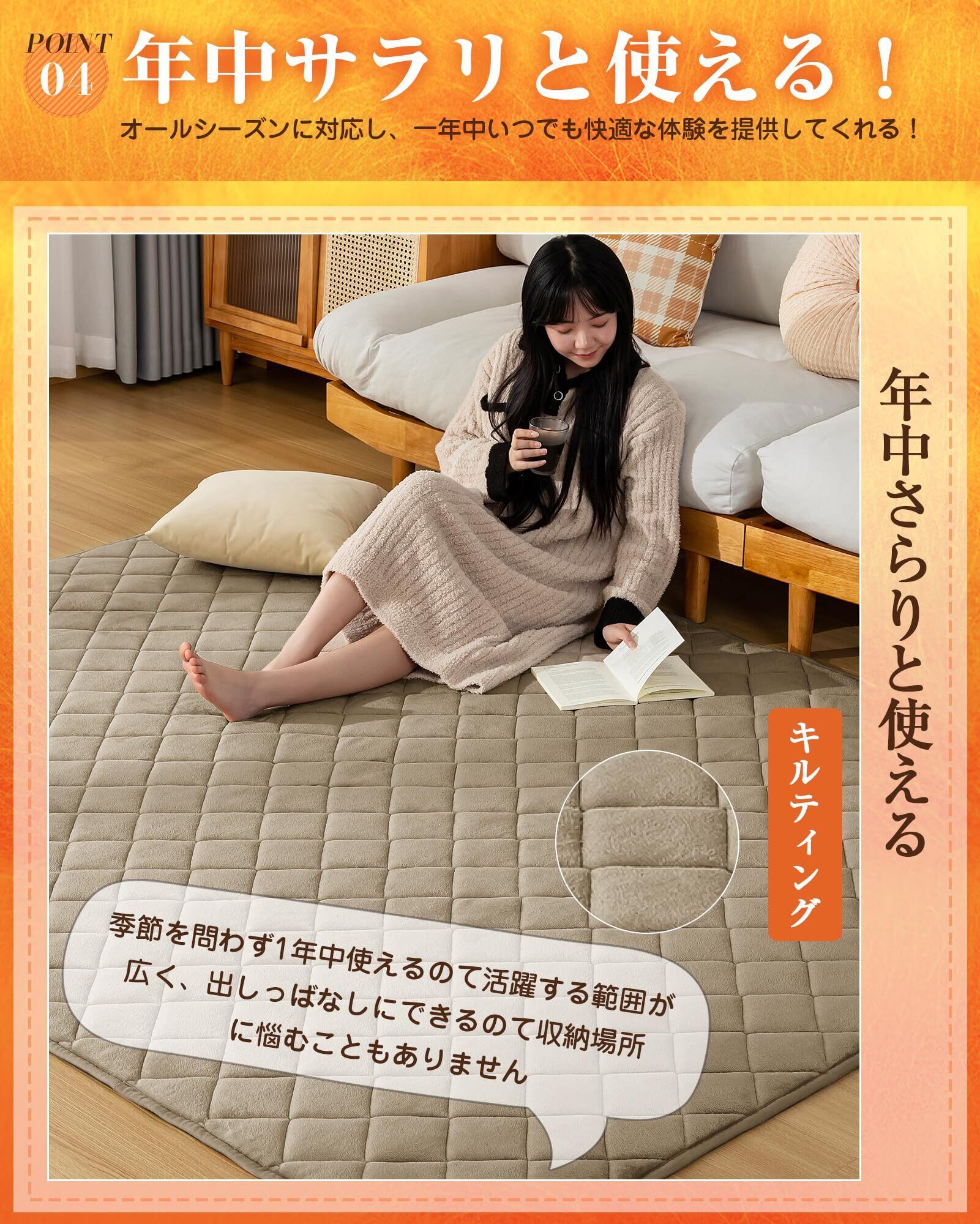 【4層構造のこたつ敷き布団で保温性アップ】ラグやカーペットではなく、こたつ専用の敷布団を使うだけで暖かさが格段に向上します。敷布団が厚手なので、クッション性も増し、長時間座っていても快適です。こたつ布団には厚みのある綿がしっかり詰められており、それだけで十分に暖かさを提供し、こたつの熱を逃しません。さらに、節電効果も高く、見た目もほっこりとした暖かみを楽しむことができます。