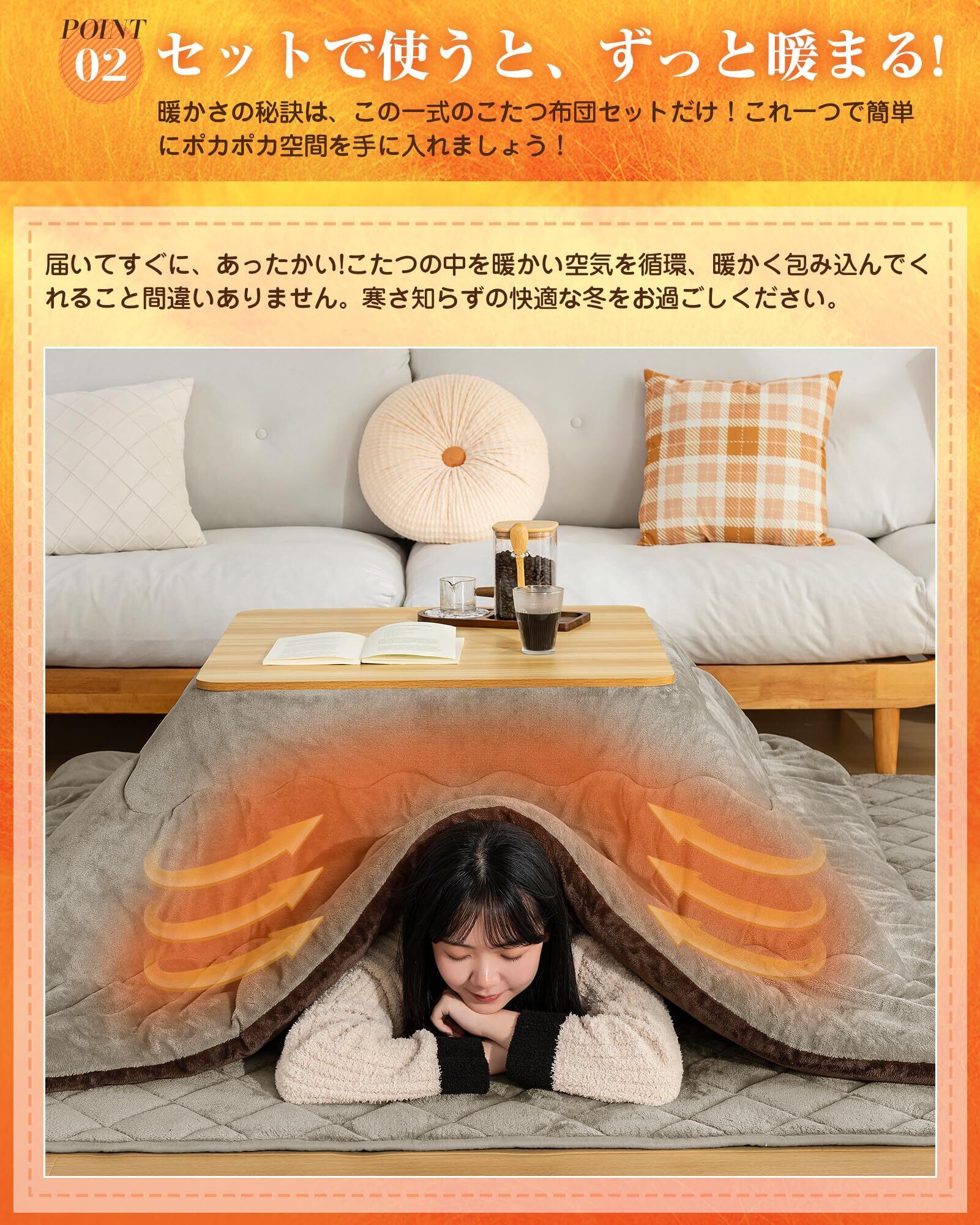 【掛敷セットのこたつ布団】掛け布団と敷き布団がセットになったこたつ布団で、敷き布団のサイズや柄を気にする必要はありません。掛け布団に最適なサイズで、同じ柄の敷き布団を使うことができ、簡単に統一感を演出できます。
