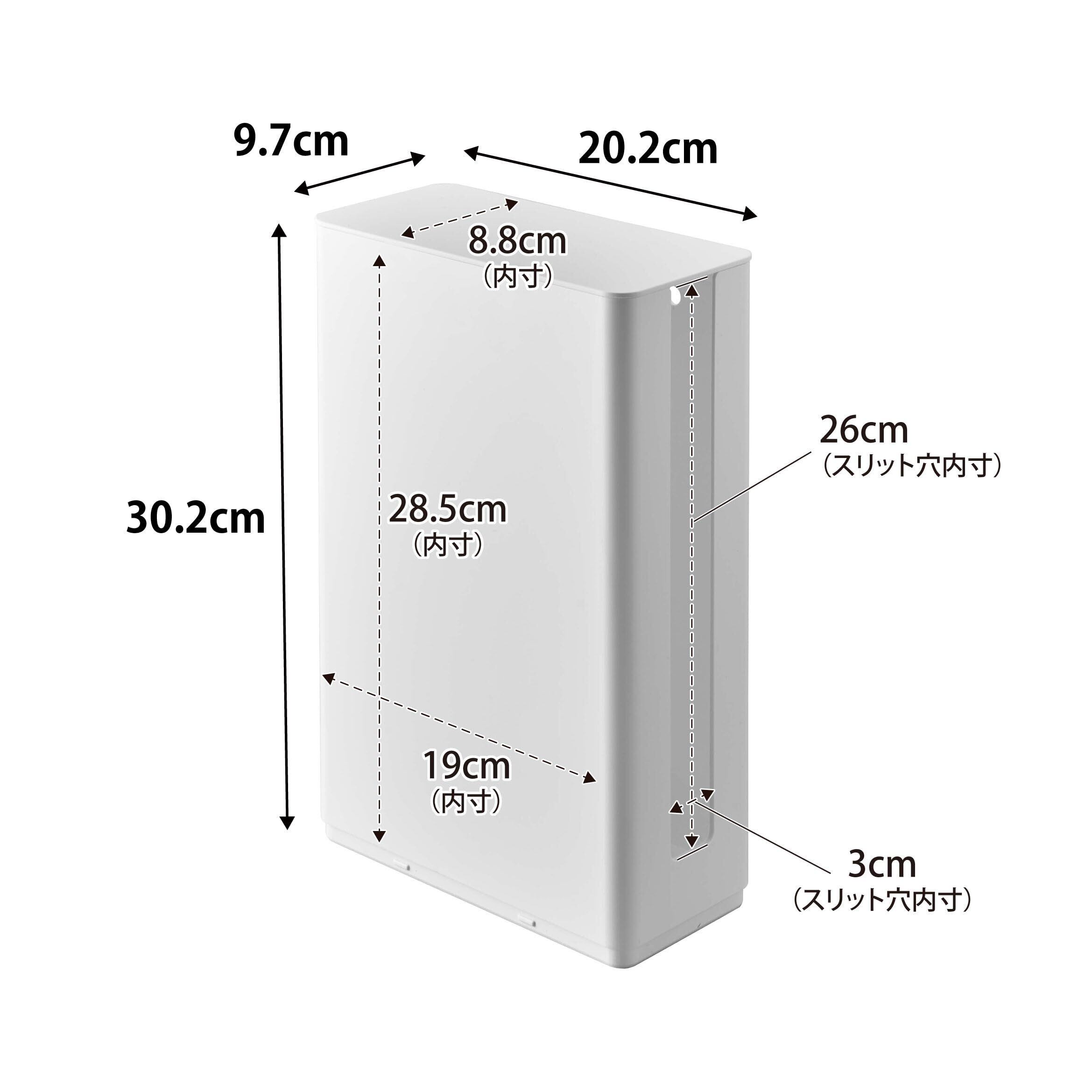 商品サイズ:約W9.7XD20.2XH30.2(蓋含む)cm ▪内寸:収納部:約W8.8×D19×H28.5cm スリット穴:約W3×H26cm