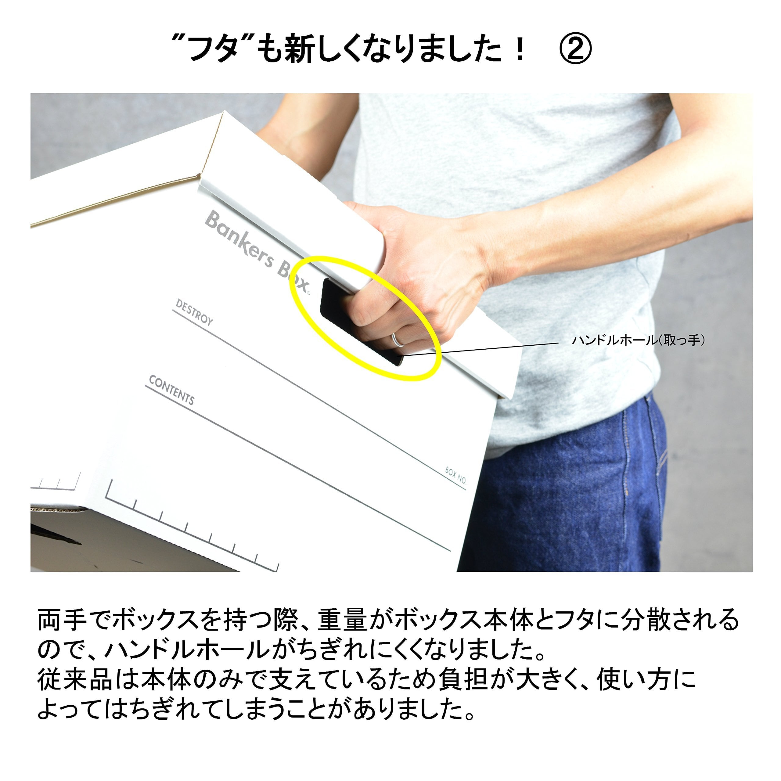 外観デザインをアップデート! ひと目でバンカーズボックスと分かる構成要素は大きく変えず、モダンでよりミニマムに、そしてシリーズ同士で組み合わせても統一感がでるようモジュール化しました。また、自由に書き込んだりセルフカスタムするための余白をできるだけつくり、且つ付箋やラベル・マスキングテープをまっすぐ貼れるようガイドも設けています。構造面では、フェローズ独自の組み立て方法"Fastfold(R)"を採用し、わずか3秒で本体の組み立てを可能にしました。貼り合わせ面を増やしたことで耐荷重性能は20%以上向上しています。
