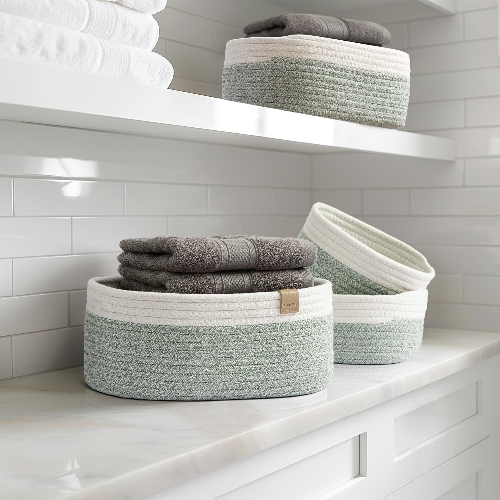 LA JOLIE MUSE 収納バスケット カゴ ロープストレージバスケット 編み込みコットンロープ製バスケット バスルームシェルフ用 収納ボックス4個セット アイビーグリーン