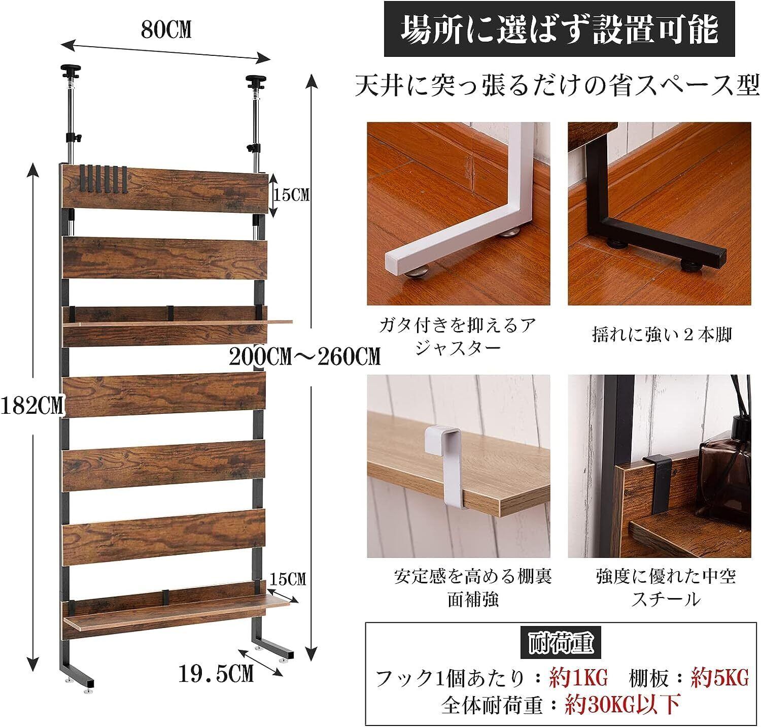【本体サイズ】:(約)幅80×奥行19.5×高さ200~260cm 【材質】本体:プリント紙化粧繊維板 脚部 フック:スチール(粉体塗装)つっぱりパイプ:スチール